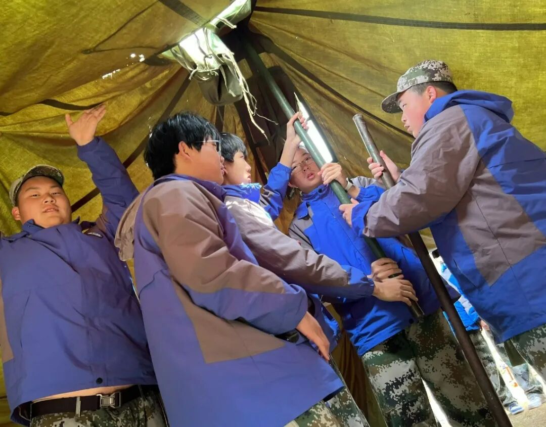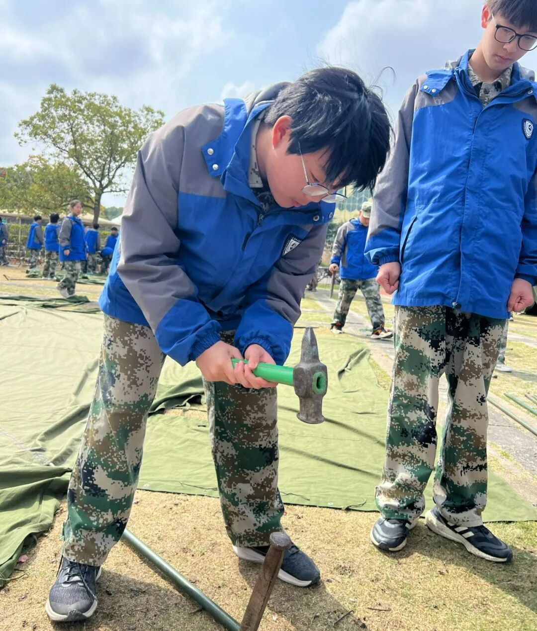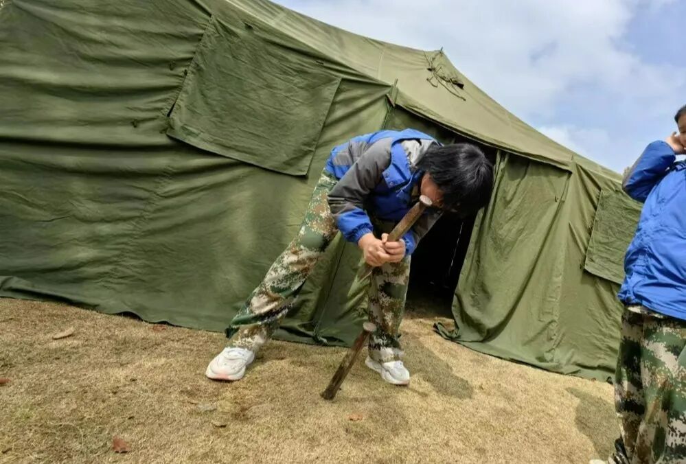 27日上午,同学们在营地教官的指导下学习战地扎营和捕俘拳。在搭建帐篷的过程中,从搭建帐篷框架、固定地钉到拉帐绳,体现了每位同学齐心协力、一丝不苟的态度。