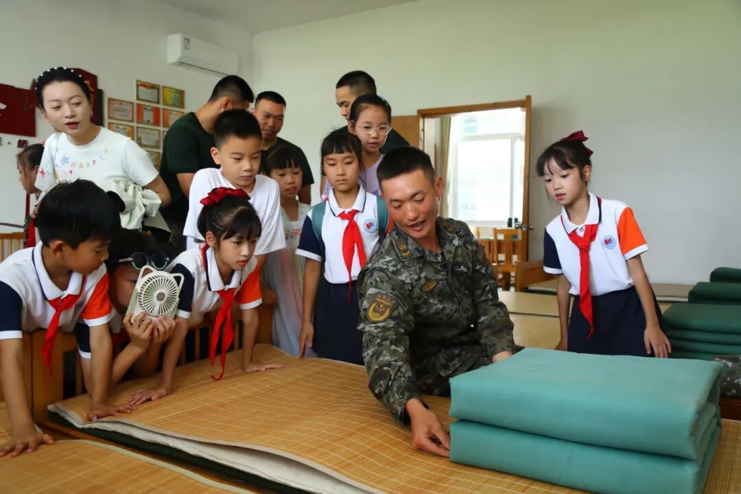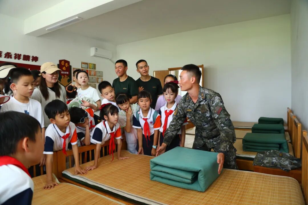 最热闹的是互动环节。队员们站在蔡永祥生前的床边,“蔡”班长拿出刚叠好的被子进行现场教学,那被子方方正正、棱角分明,像一块整齐的“豆腐块”,引得孩子们发出阵阵惊叹,响起了阵阵掌声。