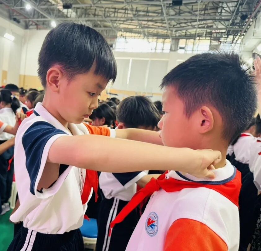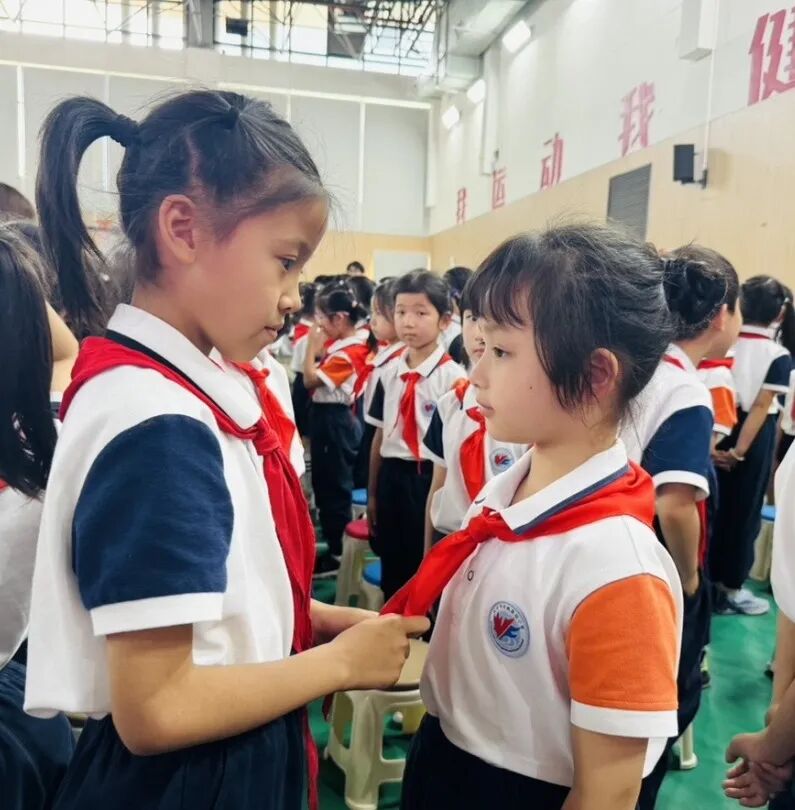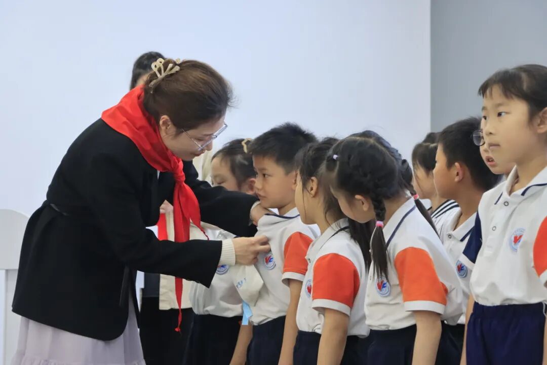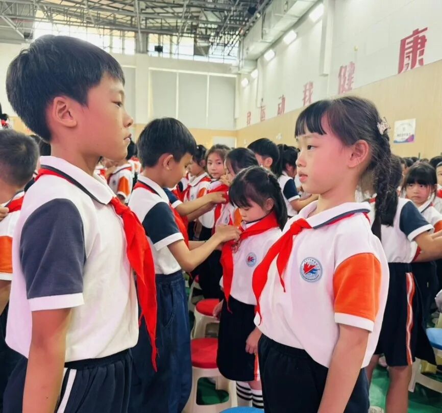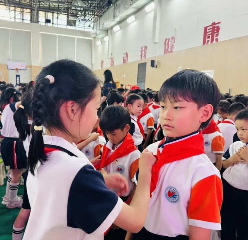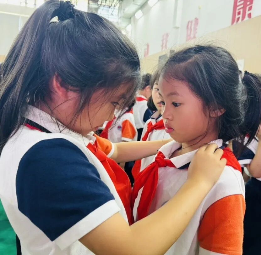 在全体准队员期待的目光中,大队辅导员胡安琪老师宣读入队决定,德育研究中心副主任李春雨老师宣读2024级入队名单,每位新队员的脸上都洋溢着激动的笑容,这无疑是他们人生中极为重要的时刻!二年级的队员们满怀祝福亲手为新队员们披上了人生中的第一条红领巾,祝贺他们成为一名光荣的少先队员。