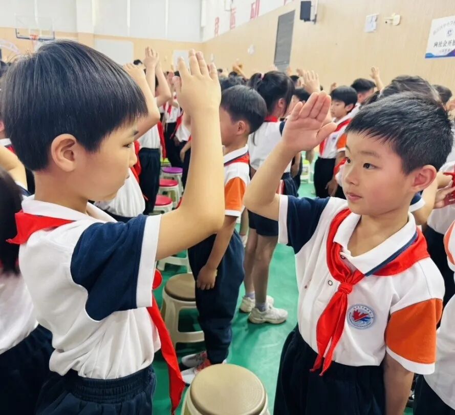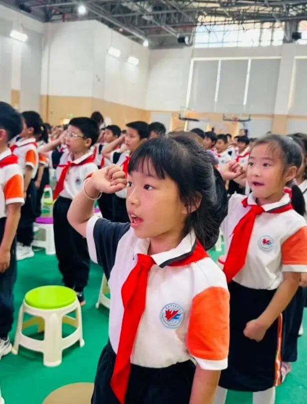 大队辅导员胡安琪老师带领新队员们坚定呼号。“时刻准备着!”全体队员齐声呼号,整齐划一,充满力量。队员们高举右手,目光如炬,光荣的使命牢记心中。