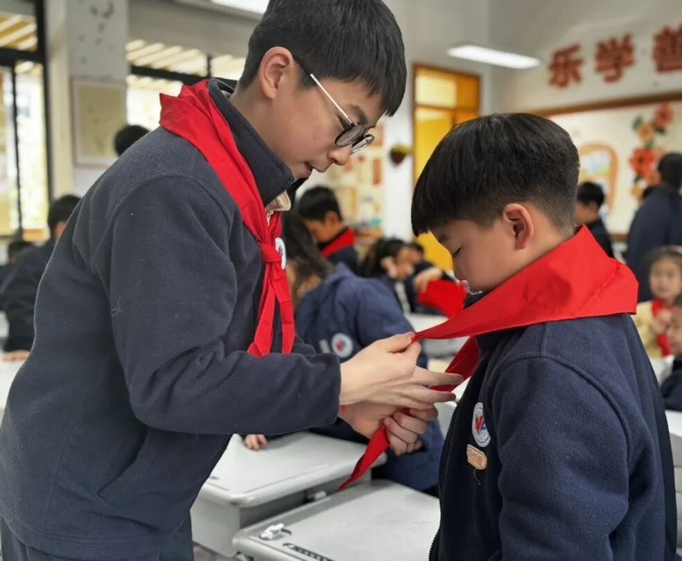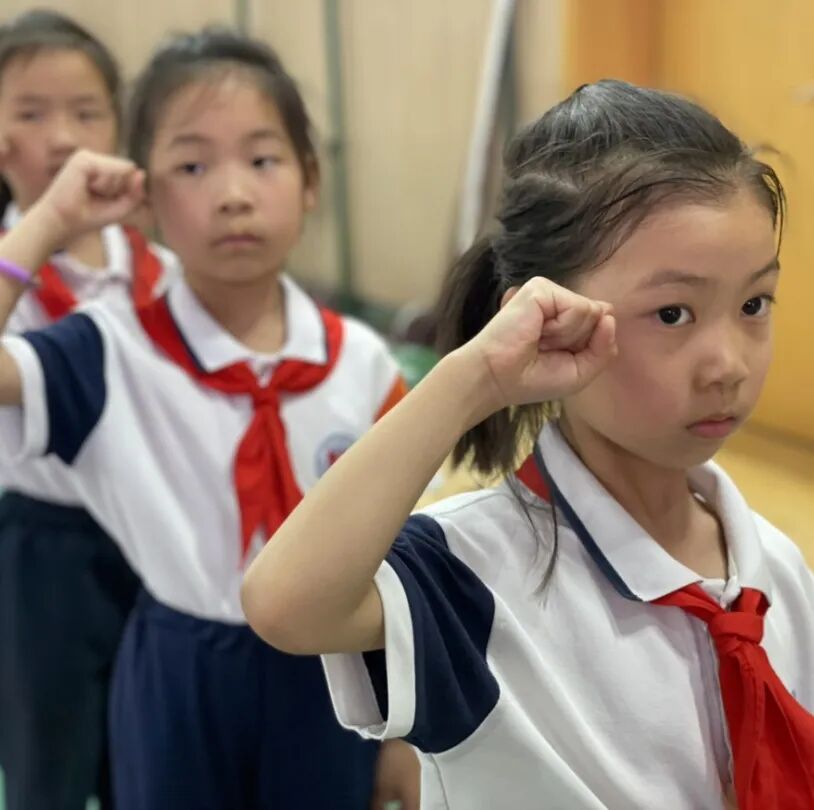 红领巾不仅是少先队的象征,更是责任与荣耀的传递。红领巾的每一次轻抚都是一种激励,告诉新队员们要带着这份荣誉和责任,勇敢地走向未来。少先队大队长马妤萌带领新队员宣誓,老队员重温誓词。每位队员整齐划一地举起右拳,发出属于自己的呐喊!