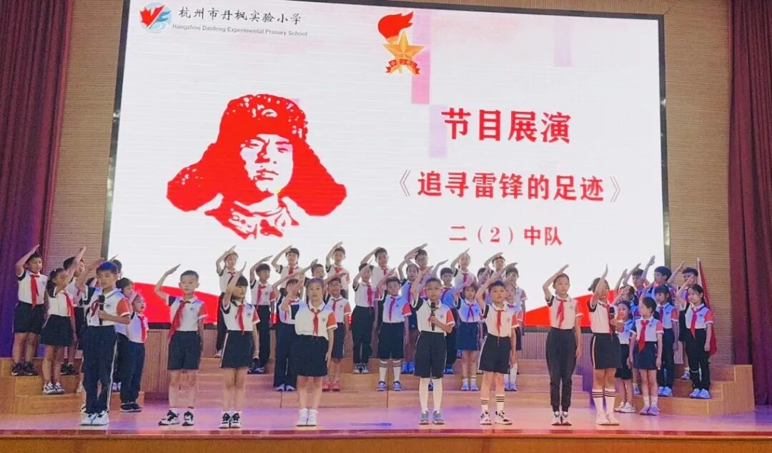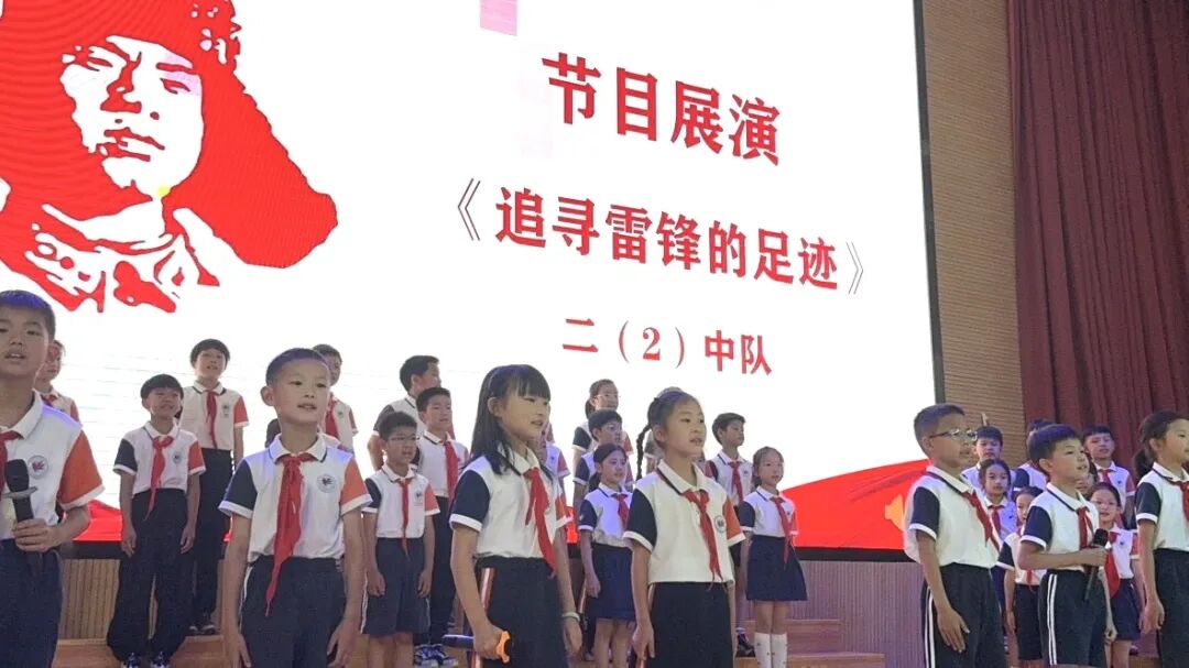 仪式在二(2)中队的精彩诵读节目《追寻雷锋的足迹》中拉开帷幕。孩子们用稚嫩而坚定的声音,深情讲述雷锋叔叔的感人事迹,展现了新时代少年对雷锋精神的传承与敬仰,为现场观众带来了一场温暖而深刻的视听盛宴,也点燃了新队员们入队的热情。