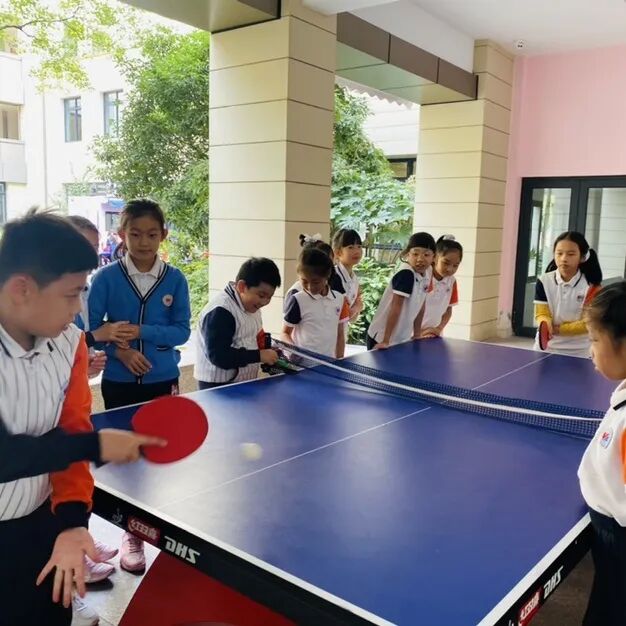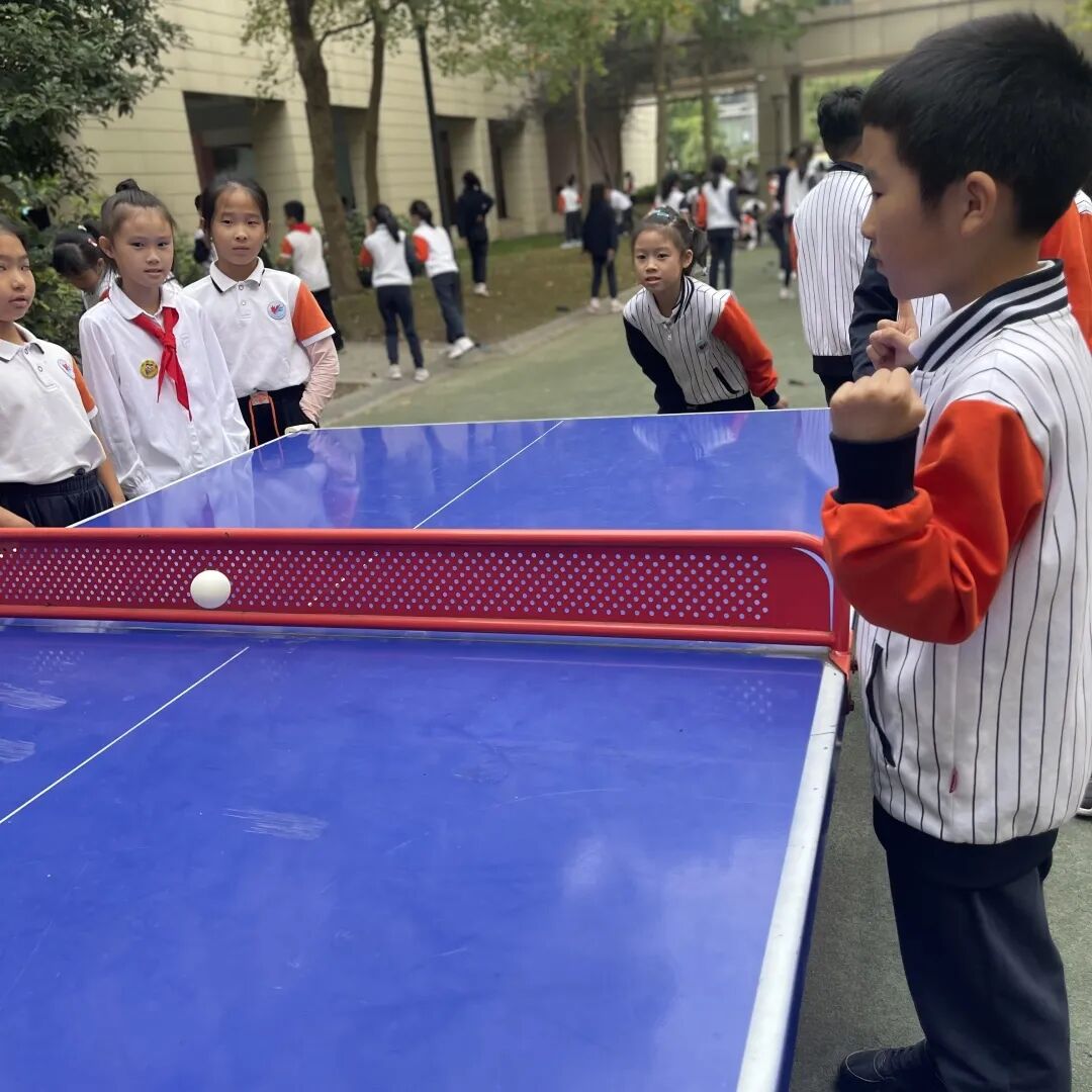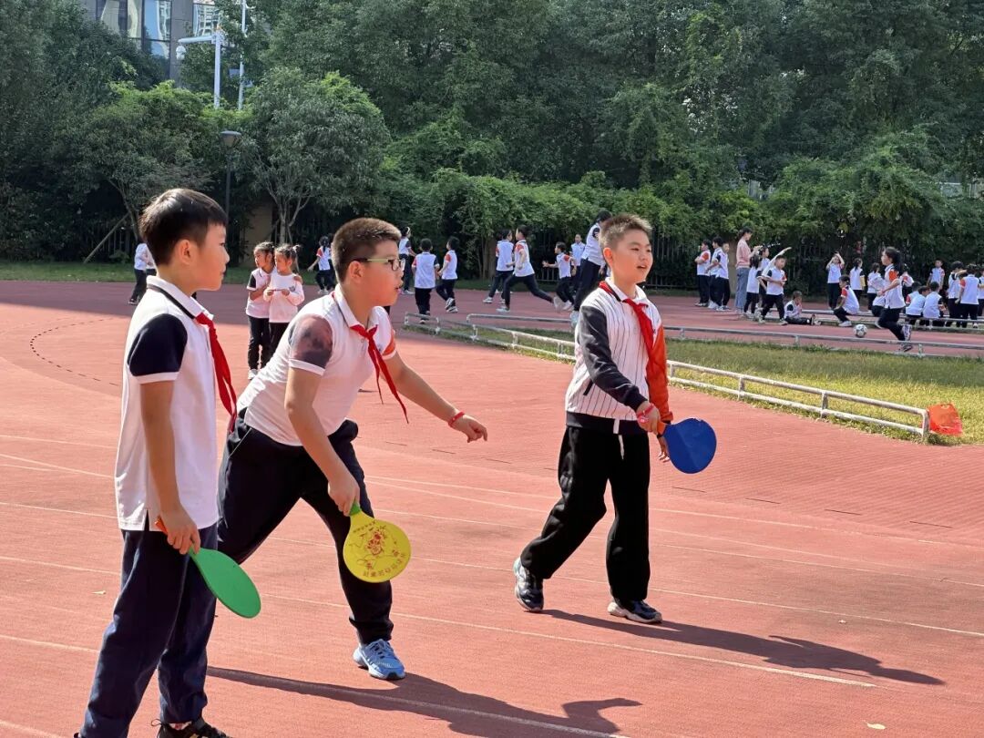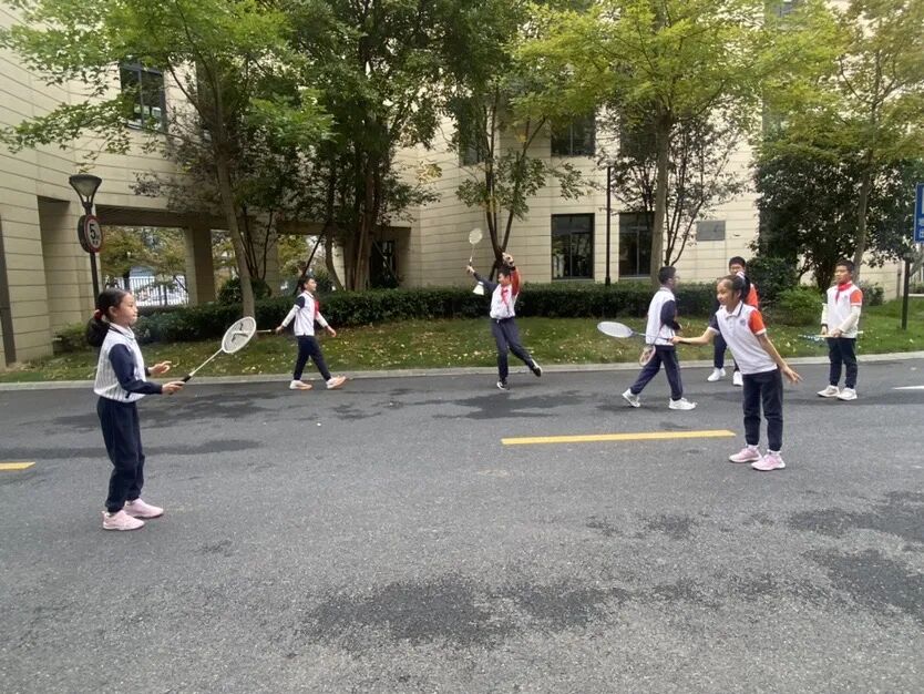 “乒乒乓乓”这是同学们在阳光体育大课间活动中进行乒乓球的对决,球在拍上打,球往桌上跳,同学们十分专注和开心;在学校的操场上羽毛球和板球很流行,小小的球在他们的手中尽情飞舞,凌空飞跃,挥拍一击,同学们笑得开心,打得尽兴;体育器械区,同学们充满活力,引体向上、倒挂单杠,一个个比拼着实力。