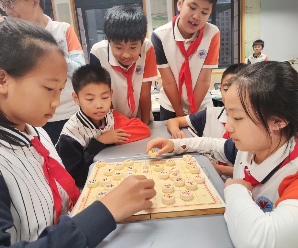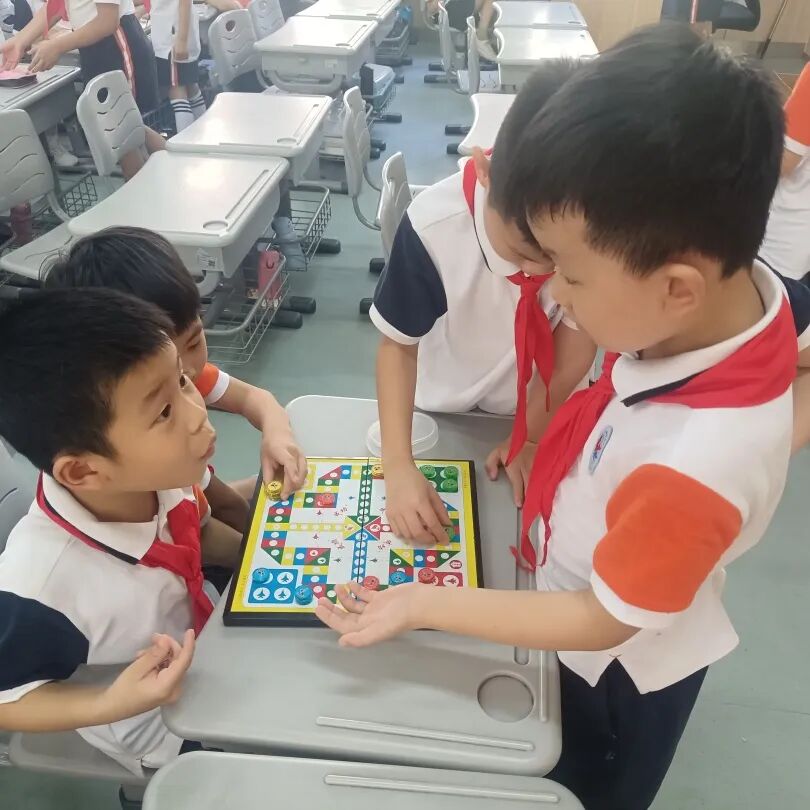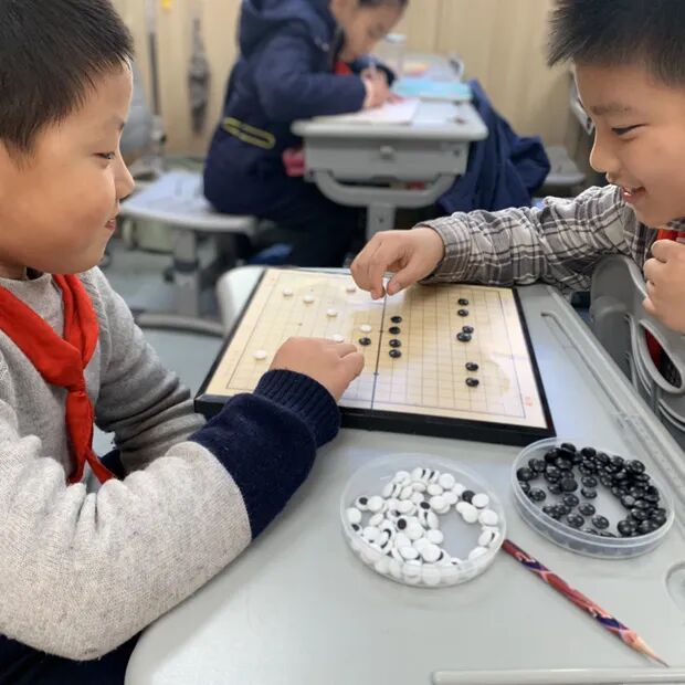 瞧!兴致勃勃的棋类小选手在博弈,他们有的下起了五子棋、有的在下象棋、跳棋。