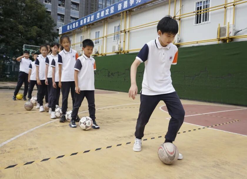 一分钟跳绳、跑步、柔韧度拉伸……足球场上,同学们也化身足球小将,快乐的足球在脚下滚动,一计“射门”,让人忍不住鼓掌欢呼。