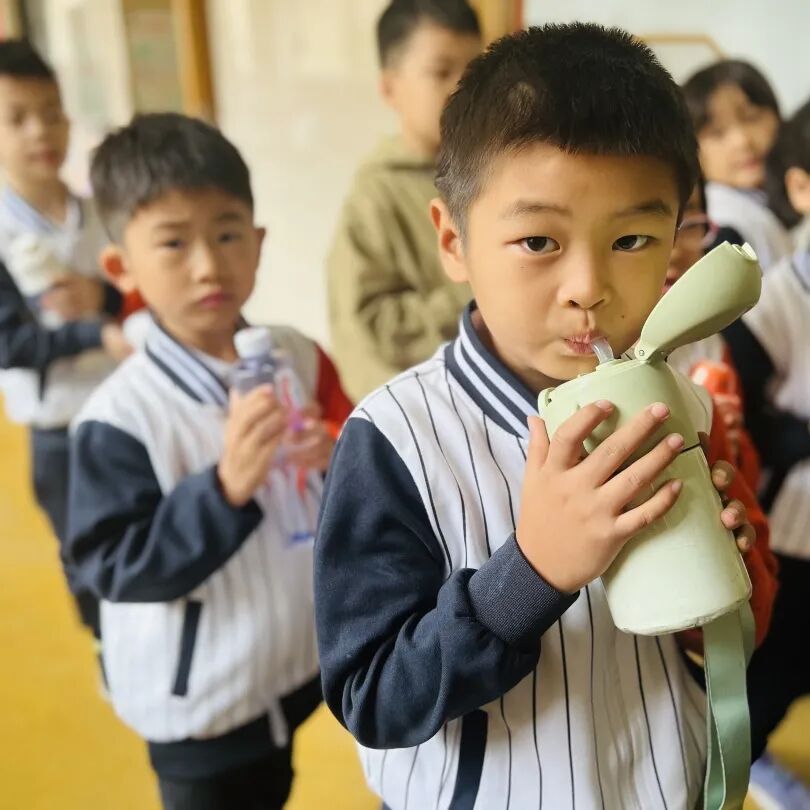 望远结束后,同学们三三两两结伴,拿着水杯去楼道的饮水机打水。以儿童视角,学校为孩子设立了温水区域,接水安全又方便。每个课间,同学们都会拿起自己心爱的小水杯饮水。有的班级还会约定:一天里喝完一整杯水后把记号签放进学号袋里。课间喝水让同学们养成了健康好习惯。