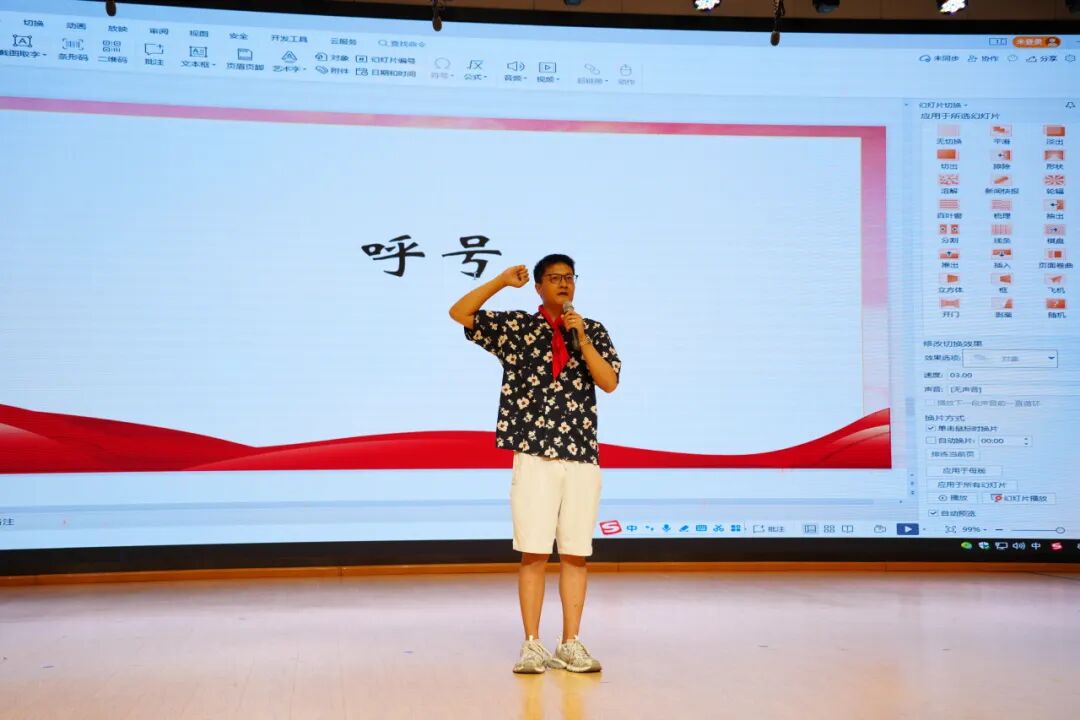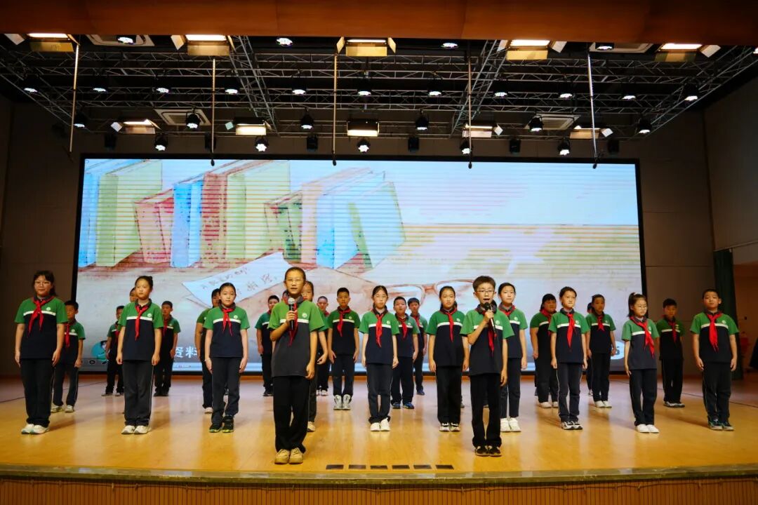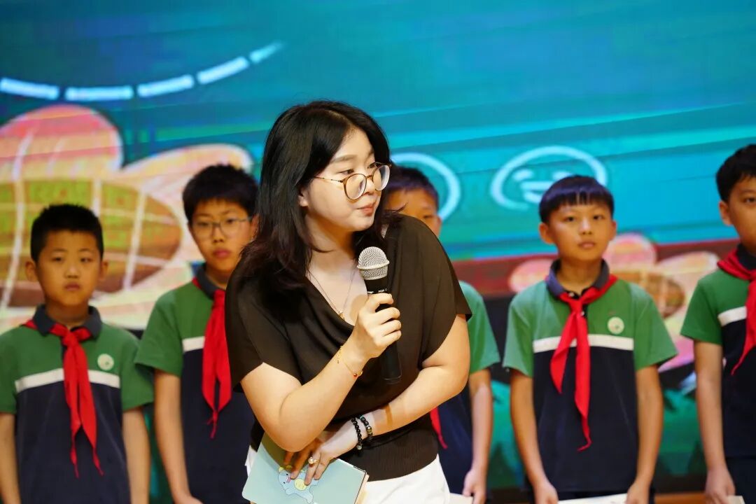 大队辅导员季老师带领全体少先队员呼号。“准备着,为共产主义事业而奋斗!”