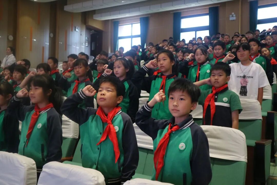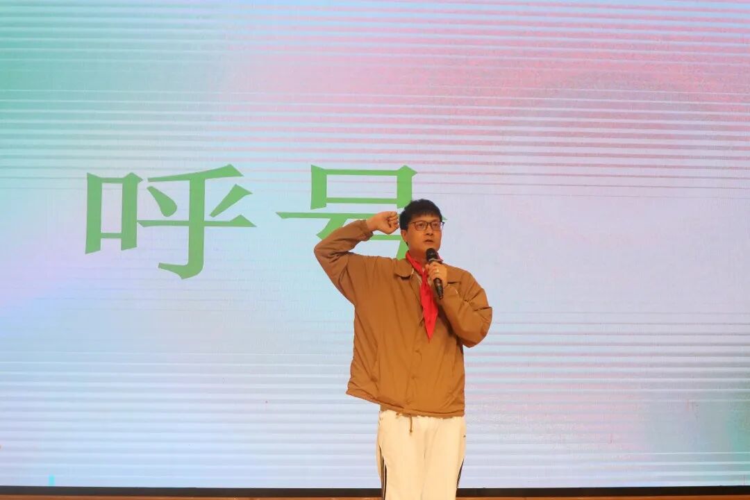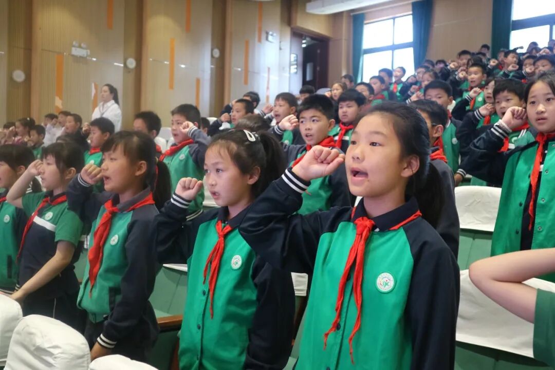 大队辅导员季老师带领全体少先队员呼号。“准备着,为共产主义事业而奋斗!”