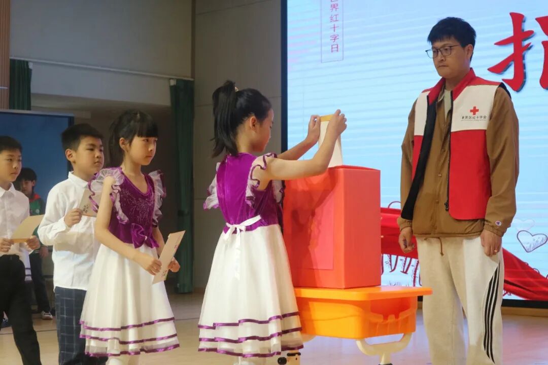 前期由大队部和卫生室向全体师生发出为全区特困少儿募捐倡议书,希望人人都伸出援助之手,发扬红十字人道救助精神,奉献出自己的一份爱心。5月12日主题活动上,班级学生代表、教师代表将准备好的爱心捐款郑重地放进捐款箱。