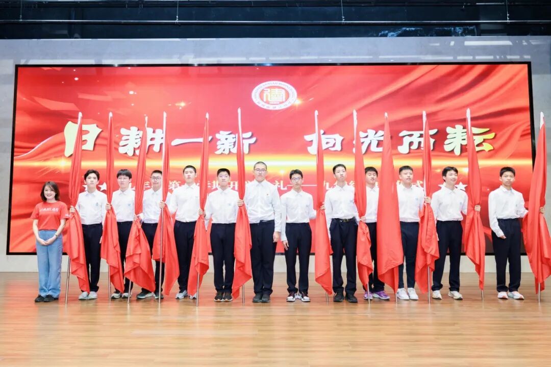 陆校长庄严授旗给各班旗手。仪式庄重有序,旗手们接旗后用力挥舞,旗帜翼翼生风。