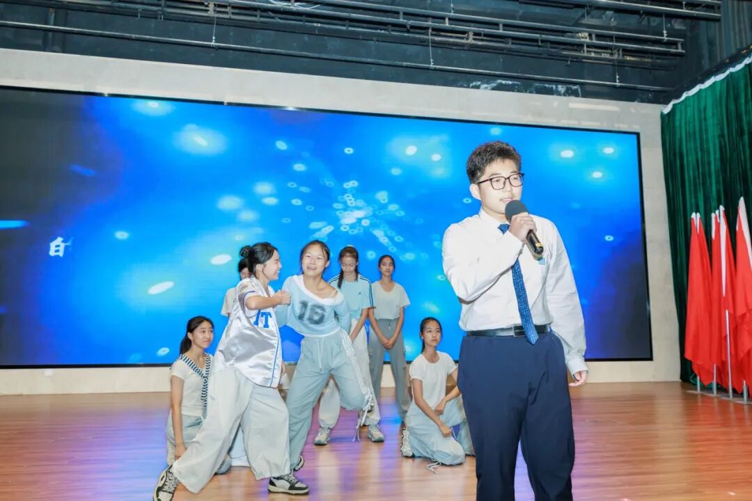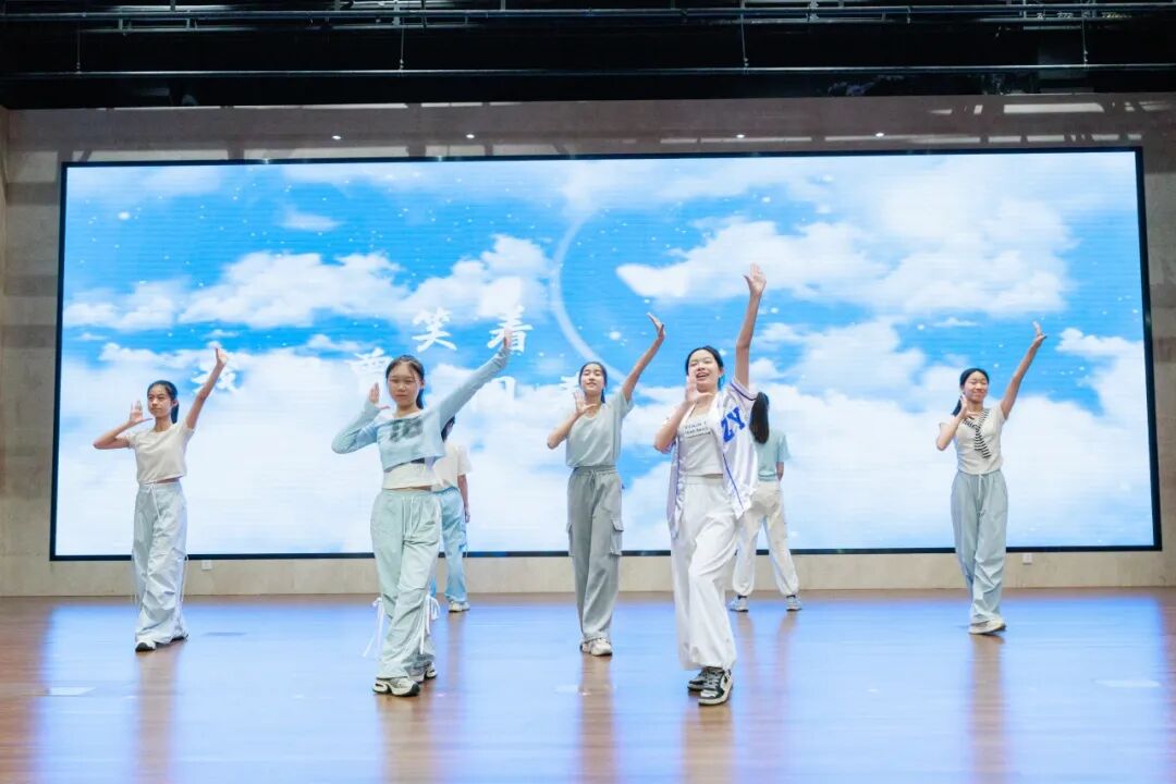 灯光一暗,一众舞蹈社与合唱团的同学来到了台上,音乐四起,歌舞相伴,活力四射,这是由林予飞老师与同学们共同编排的歌舞表演——《等你的回答》,展现了建兰学子的蓬勃朝气。