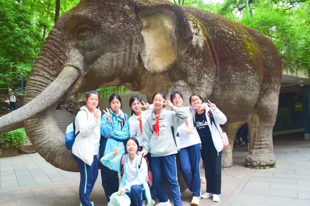 沿着绿荫小径前行,褪去了课堂的严肃,满眼皆是灵动生机。海狮在池中划出优雅弧线,溅起的水花引来阵阵欢呼;斑马群踏着“黑白交响曲”,孔雀展开尾羽,仿佛在与同学们的蓝色校服比美。镜头下,无论是借位托举的“大象”、与羊驼的“发型匹配”,还是小队与各位动物友人的珍贵合影,每一帧都是青春的印记。