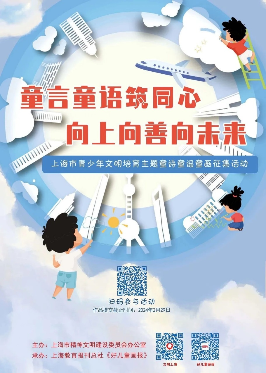 为大力弘扬中华优秀传统文化,广泛践行社会主义核心价值观,提升青少年文明素养和城市文明程度,上海市精神文明建设委员会办公室特举办“童言童语筑同心 向上向善向未来”上海市青少年文明培育主题童诗童谣童画征集活动。(作品具体要求和提交请扫下方图片中的二维码)