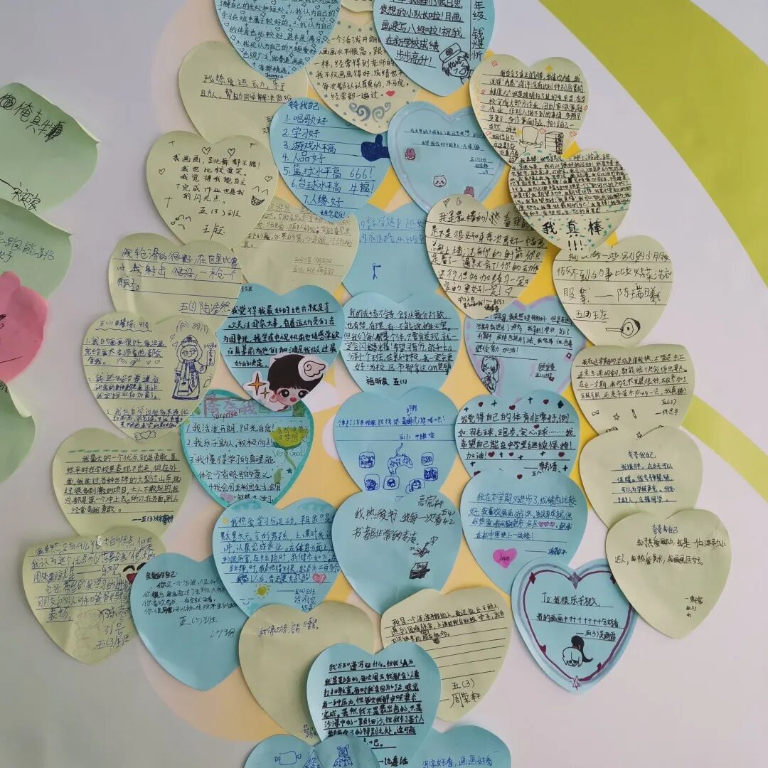 在5月25日“我爱我”期间,组织三~五年级学生开展“夸夸我自己”的活动。同学们在便签条上勇敢地写出自己的优点、特长和进步,然后贴到展板上,他们用真诚的话语点亮自信的火花,知道爱自己、欣赏自己,是心灵健康成长的重要起点。