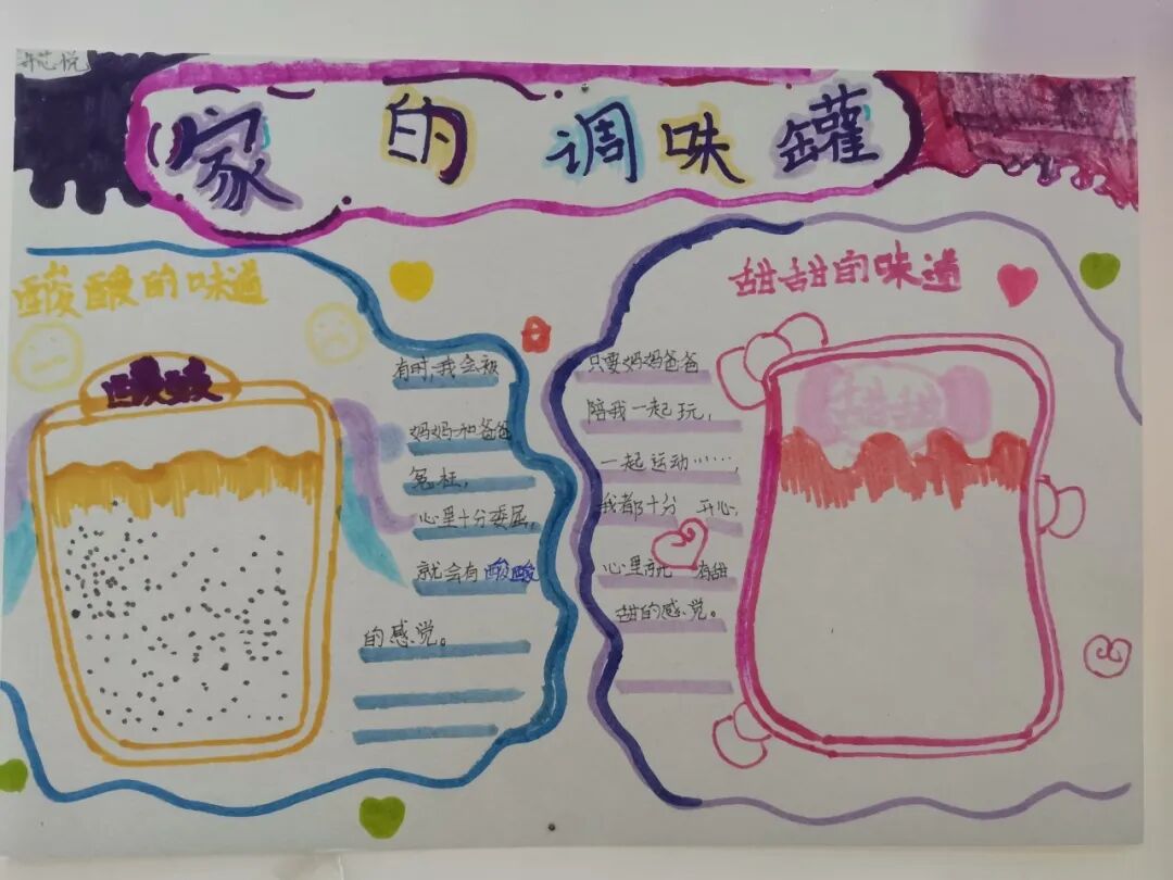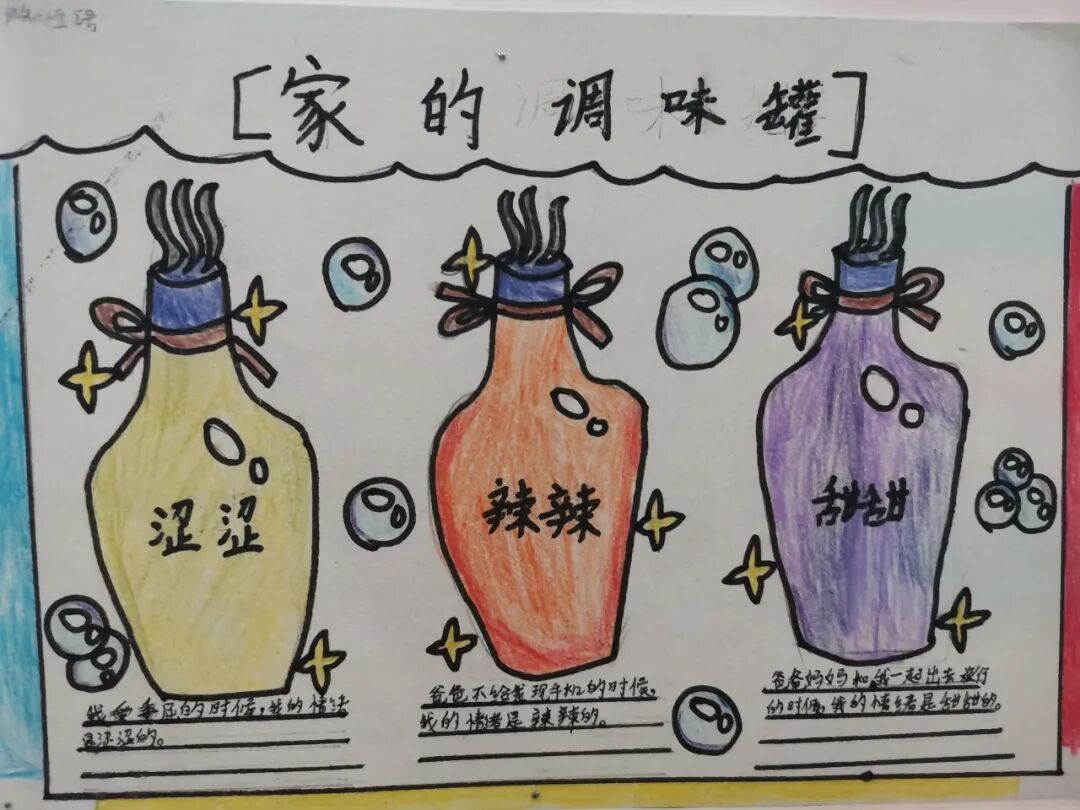 三年级学生还进行“我家的亲子互动调味罐”绘画创作,那些充满生活气息的画面,生动展现了家庭互动中的酸甜苦辣咸,充满亲情的温度与沟通的智慧。