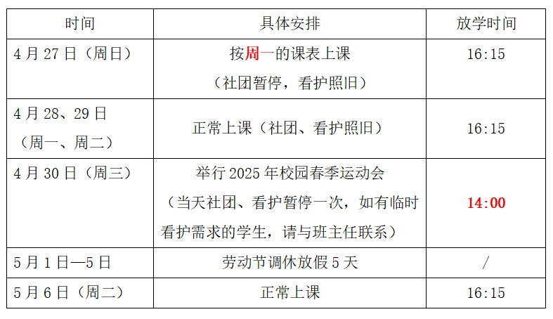 根据《国务院办公厅关于2025年部分节日安排的通知》,2025年“五·一”劳动节放假时间为:2025年5月1日(周四)至5月5日(周一),共5天。现将近期学生的作息安排告知如下: