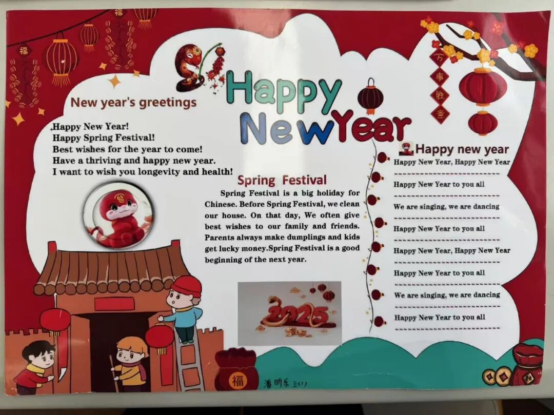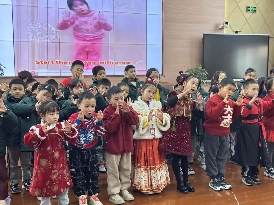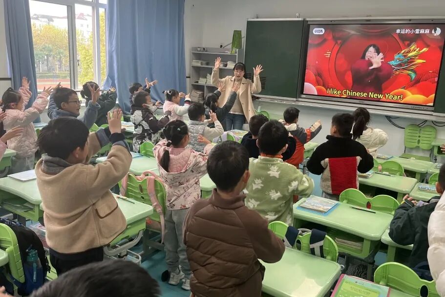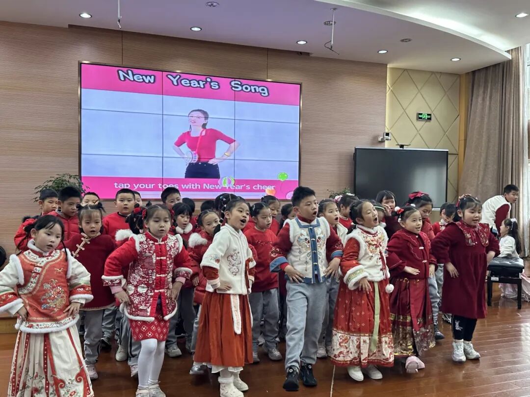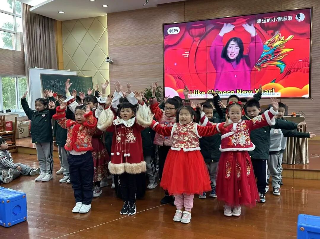 一年级以班级为单位,学唱春节主题儿歌《Happy Chinese New Year》,在欢快的旋律中感受中国年的浓郁氛围。