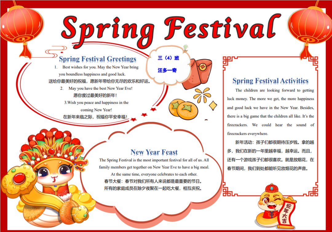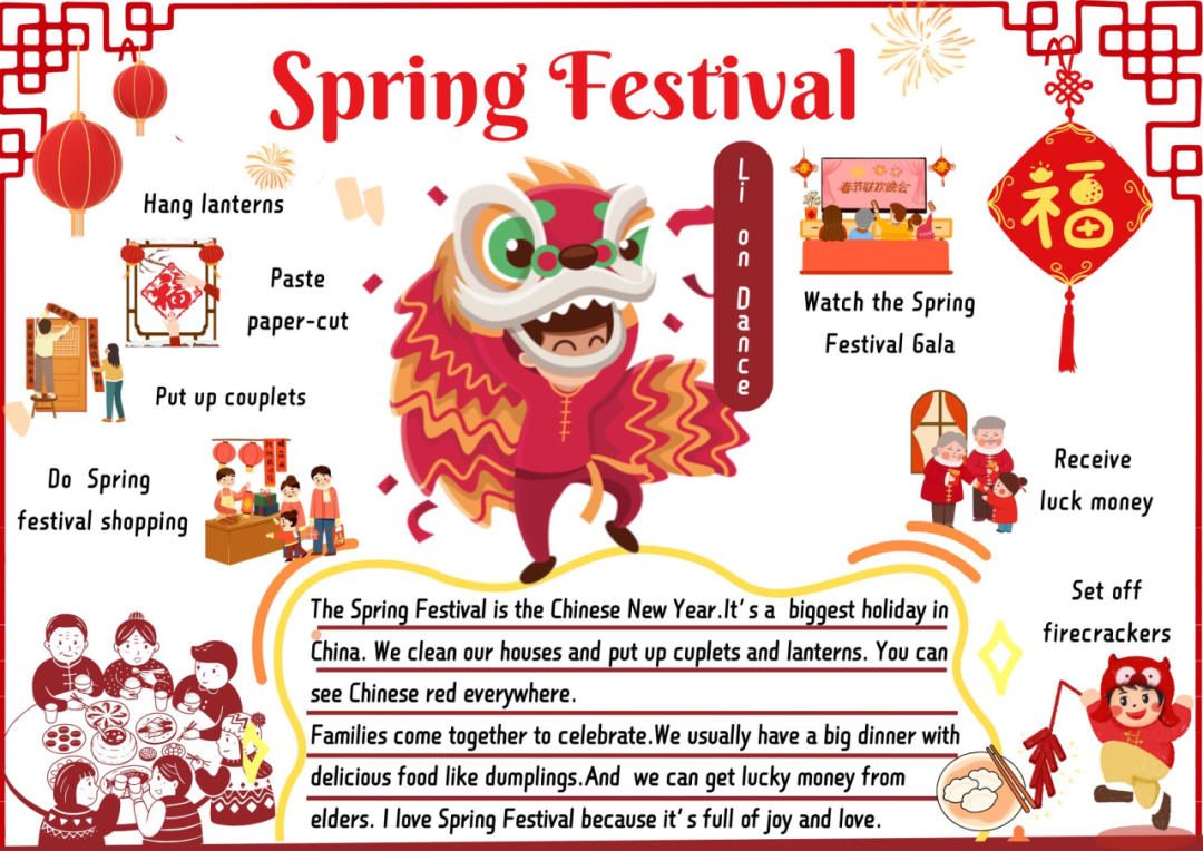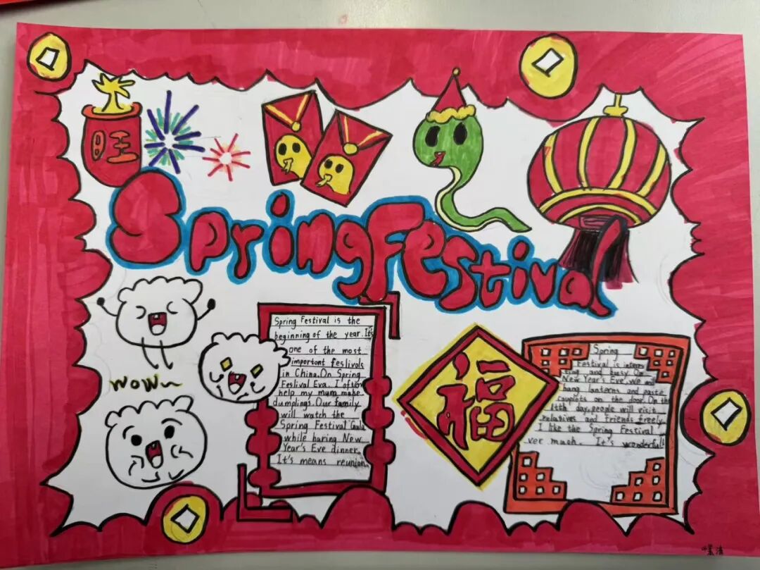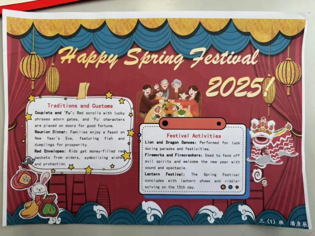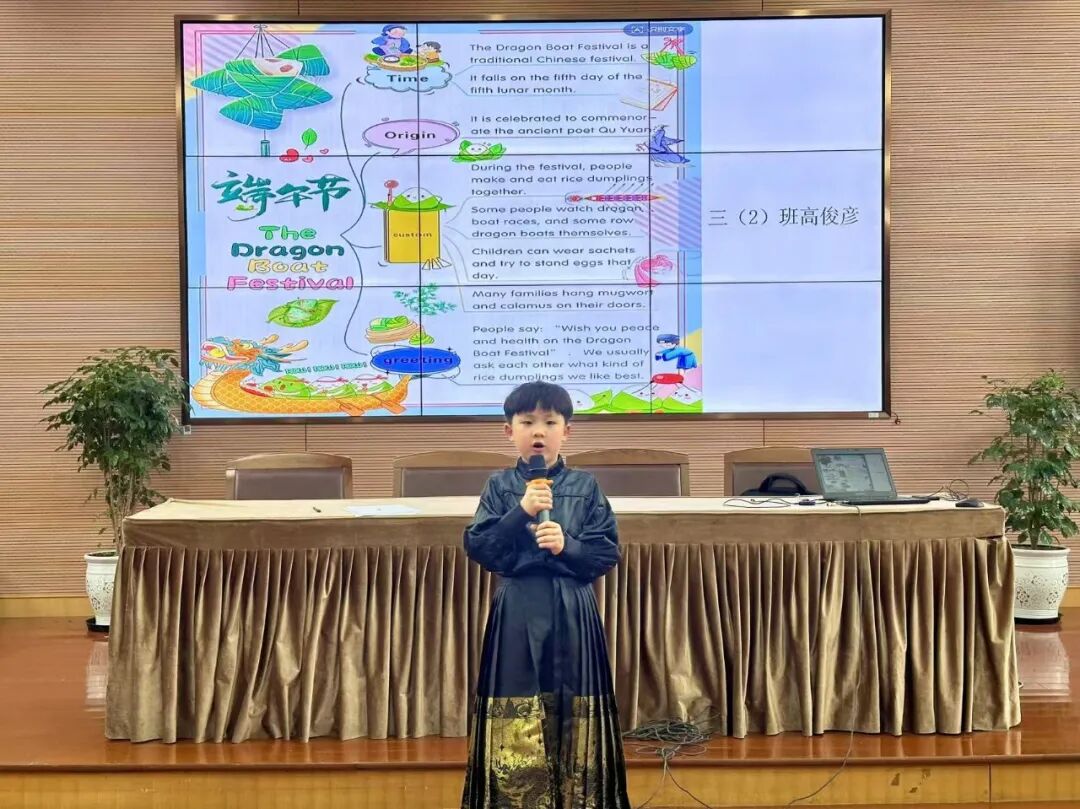 三年级的同学们也不甘示弱,他们提前在家里通过绘画、书写的方式制作了节日的思维导图,并在舞台上以英语演讲的方式弘扬传统文化。