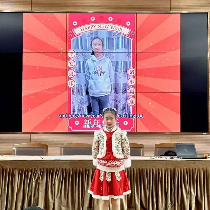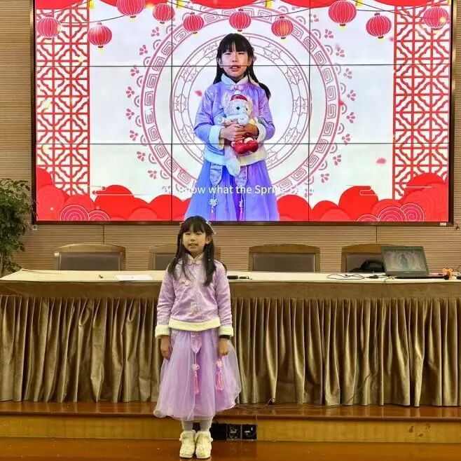 一、二年级的同学们更是换上国风服饰,活泼自信地唱着《Happy Chineses New Year》,念着英语古诗《春晓》、《悯农》、《江雪》、《静夜思》、《春夜喜雨》,将中西文化完美融合。