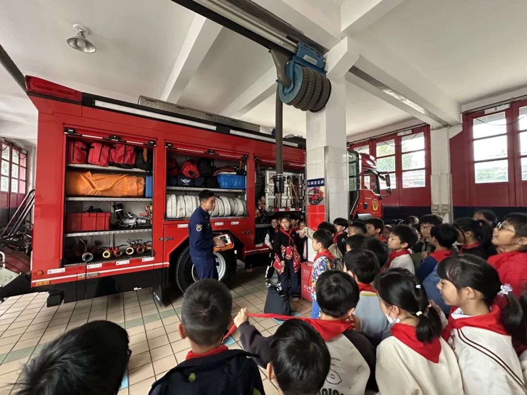 消防官兵带领同学们参观了消防车辆和器材装备,并详细介绍了各类消防车辆、器材装备的用途和功能。