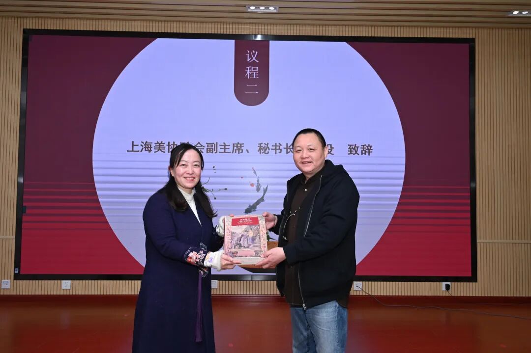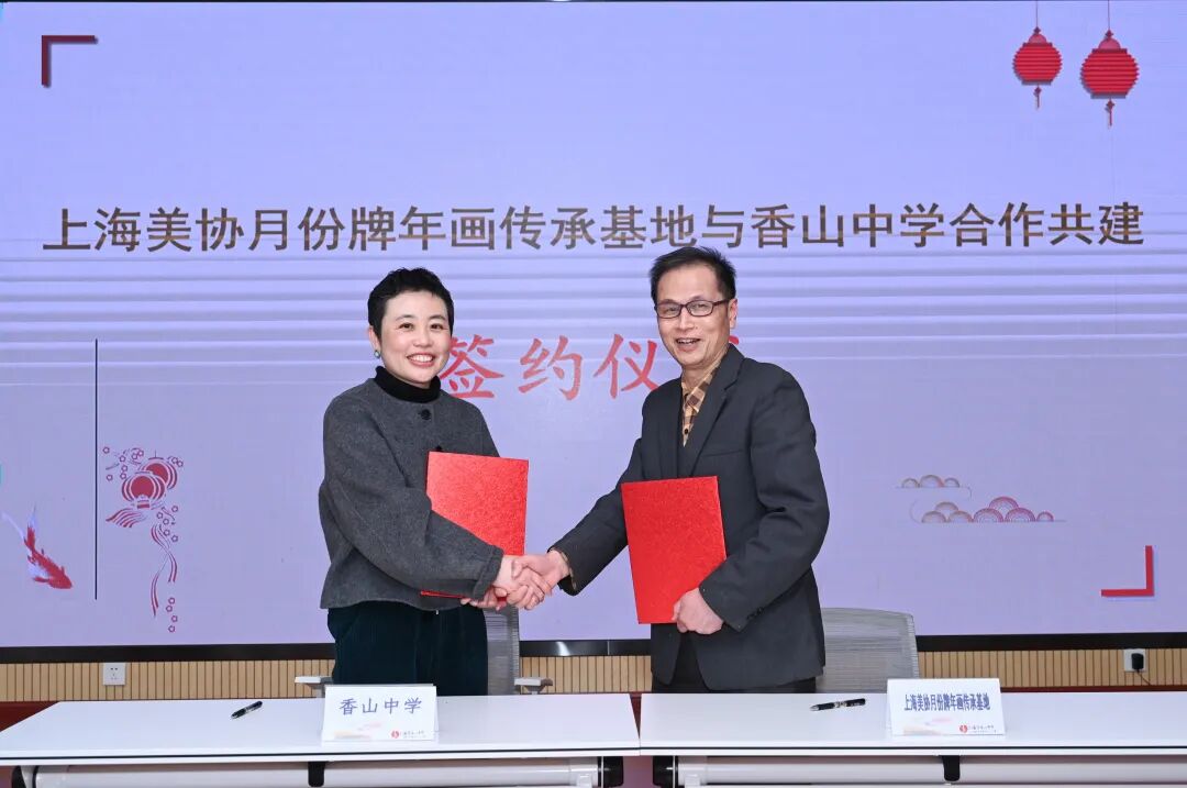 随后,丁设主席代表上海美协向阳燚书记代表的香山中学赠送了精心准备的画册,象征着双方合作桥梁的正式搭建,共同致力于月份牌年画这一宝贵文化遗产的传承与发展。在热烈的掌声中,上海市美术家协会月份牌年画传承基地与上海市香山中学正式签下共建协议。