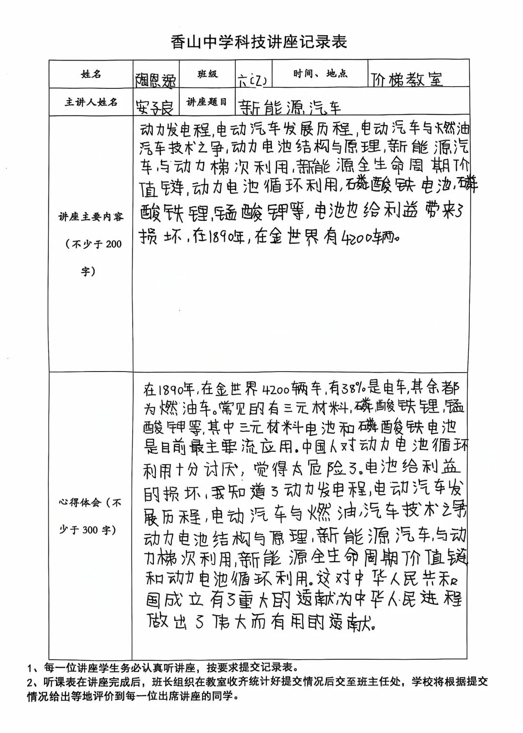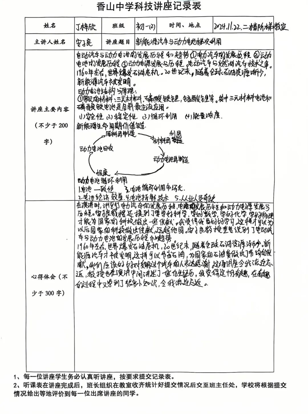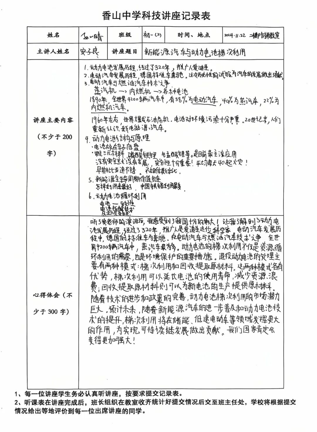 经过这次讲座,我深刻体会到,新能源汽车与动力电池的利用,不仅是技术进步的体现,更是人类对环保责任的体现。我将继续关注和学习这一领域的知识和技术,为推动绿色出行贡献自己的一份力量。