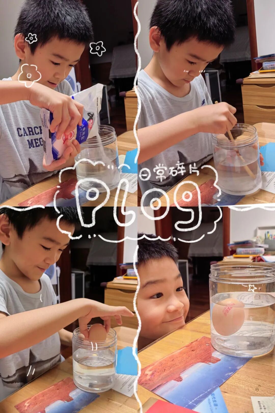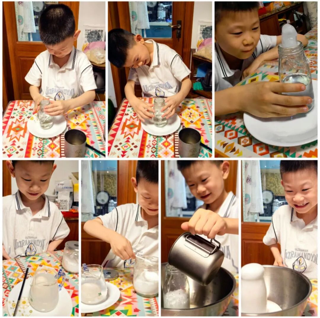 一年级的同学们在家化身小小实验员,在家长的陪伴下设计并完成一项科学小实验。盐水浮鸡蛋、彩虹吸水实验、火山爆发实验……同学们用视频或图片的方式严谨呈现一项项精彩绝伦的实验成果。