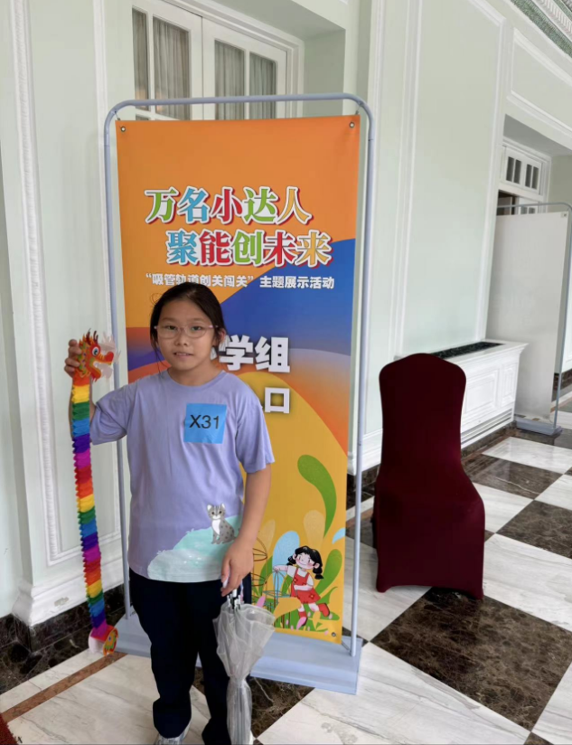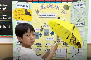 二年级吕施谕同学在观察生活的过程中深度思考,进行手工制作。申报了一项小发明——《自救速干雨伞》,在今年的全球发明大会上海赛区同年级组获得了一等奖。