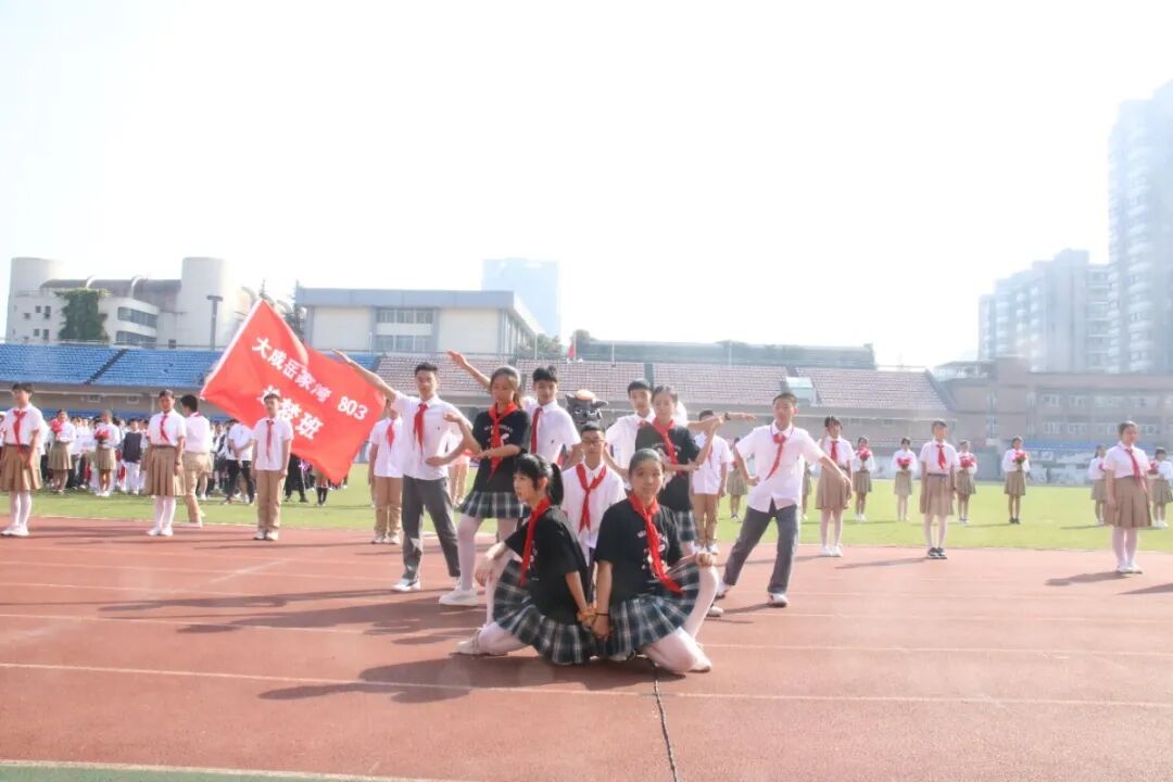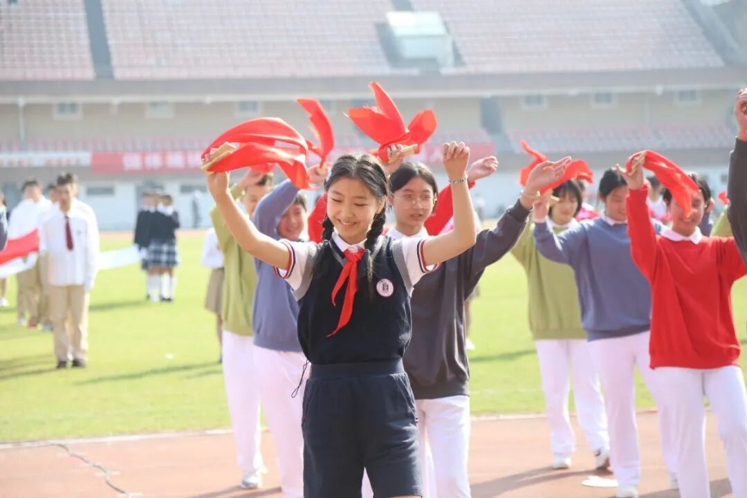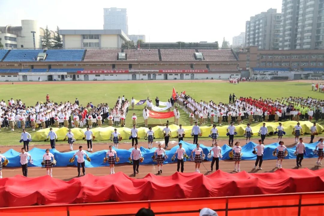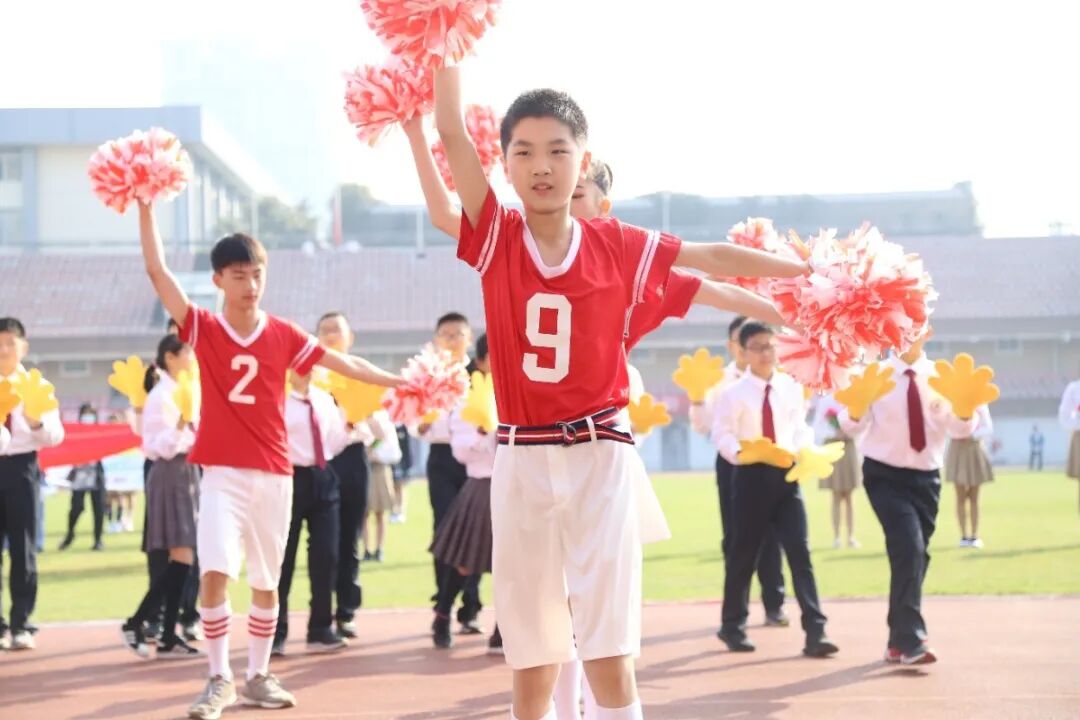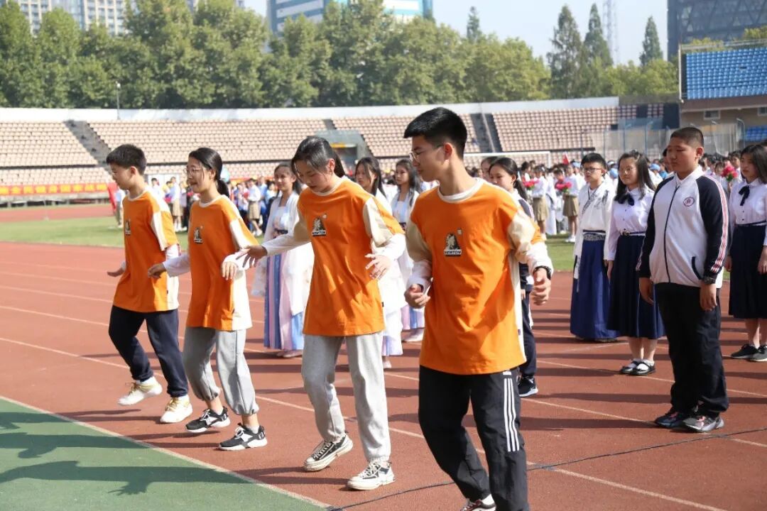 九年级以啦啦操表演的形式入场。他们铺展开三条绵延的彩带,红色代表着赤子之心,热情似火,也预示着两校合作共建蓬勃发展的前景;黄色象征着青春活力,耀眼如日月,也预示着两校师生携手共创丰收的喜悦;蓝色寓意着大气包容,广阔如海天,也预示着两校未来必将击水三千,抟扶摇而上九万里!