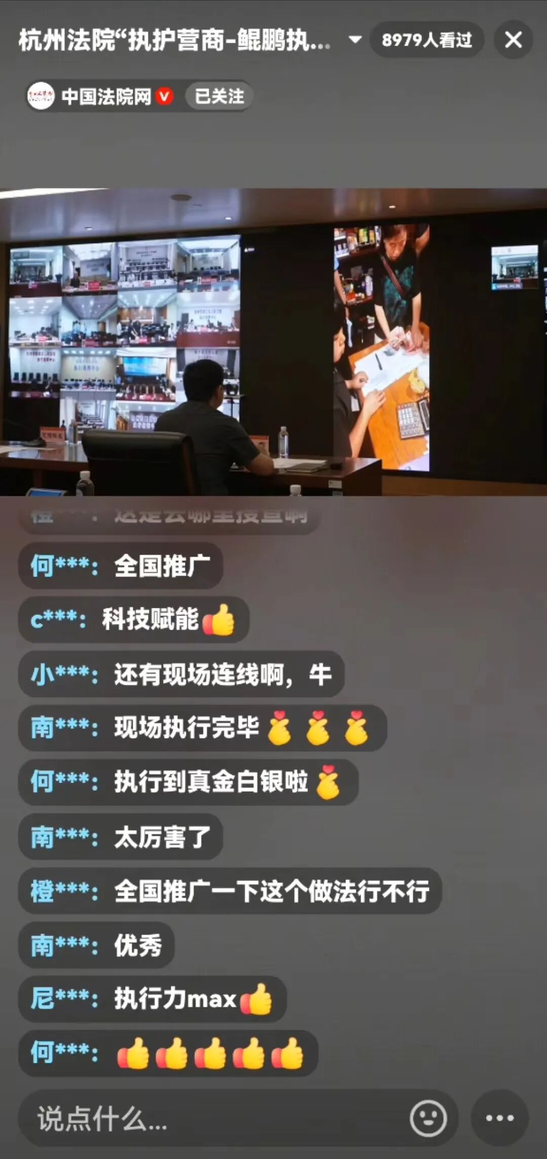 “各位网友,这里是杭州中院执行指挥中心,您现在看到的是萧山法院执行现场......”随着“央视频”app、“中国法院网”抖音号、“平安鼎”视频号、“浙江天平”视频号等十余家新媒体平台线上直播通道开启,超百万网友陆续加入直播间,零距离感受执行现场,见证执行过程。同时,还有更多人大代表和政协委员同步通过“杭州法院代表委员联络云平台”在线监督。
