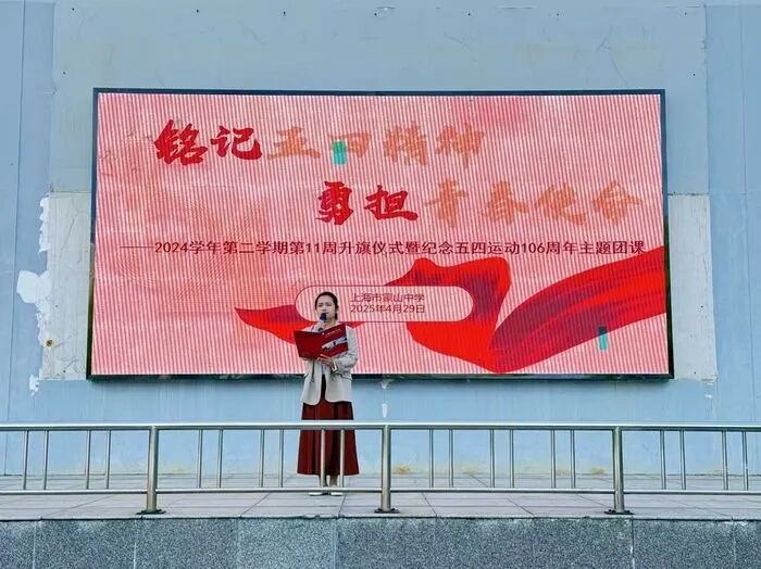 在2024学年第二学期升旗仪式暨纪念五四运动106周年主题团课上,团委书记蔡晓蕊带领学生团员们、青年们重温那段波澜壮阔的历史。