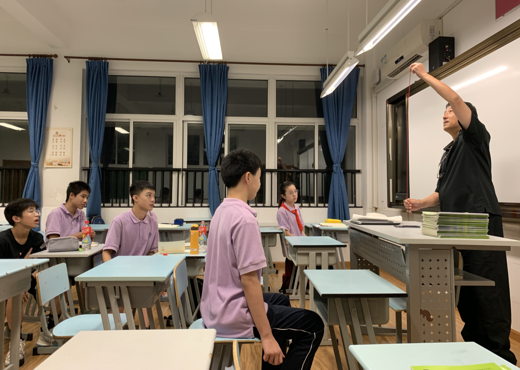 在这里,有温馨的氛围和精彩的瞬间。9月2日晚,几个孩子在研究单摆实验时遇到了困难,正在疑惑不解时,恰巧遇到了前来巡视的于校长。孩子们纷纷围住校长,向他求助。于校长笑着从口袋里掏出小球,做起了实验。小球来来回回地摆动,同学们目不转睛地观察和测量着,原先的疑问顿时化解。这时教室里传来了热烈的掌声和欢呼声,孩子们的脸上漾起了满足的笑容。