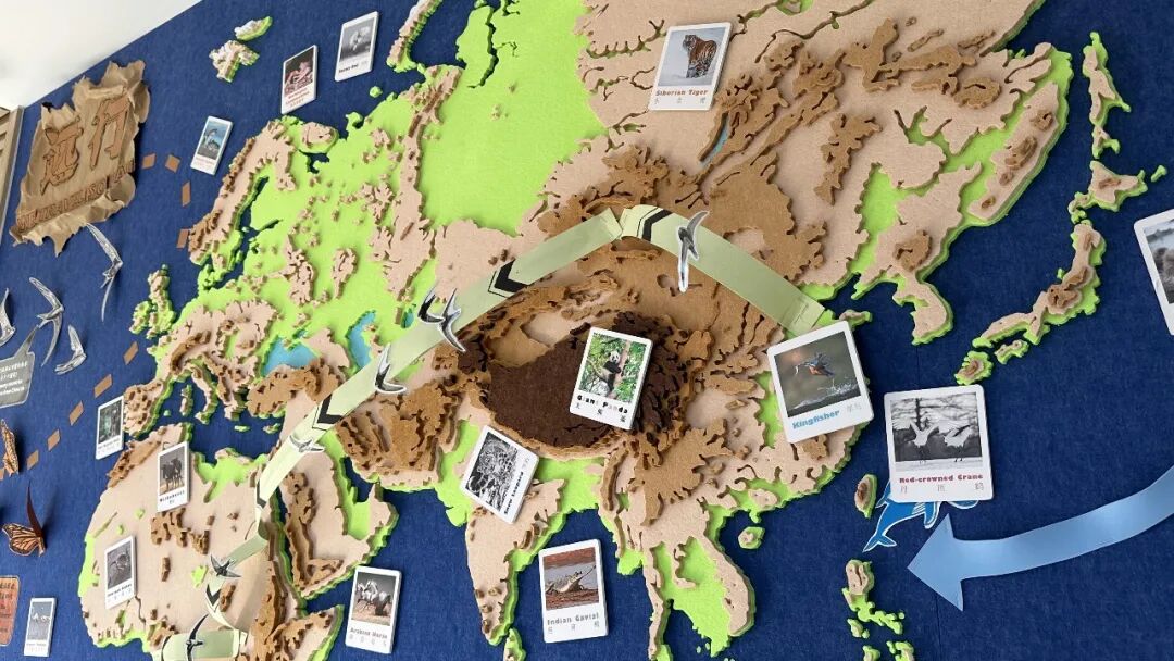 这张“立体互动”的世界地图,就是老师设计出来的辅助学习方法之一,1年级正在探究不同国家“Habitat”(动植物栖息地)的孩子们可以来到地图前,找出自己感兴趣或熟悉的动物并贴到相应的地理位置。