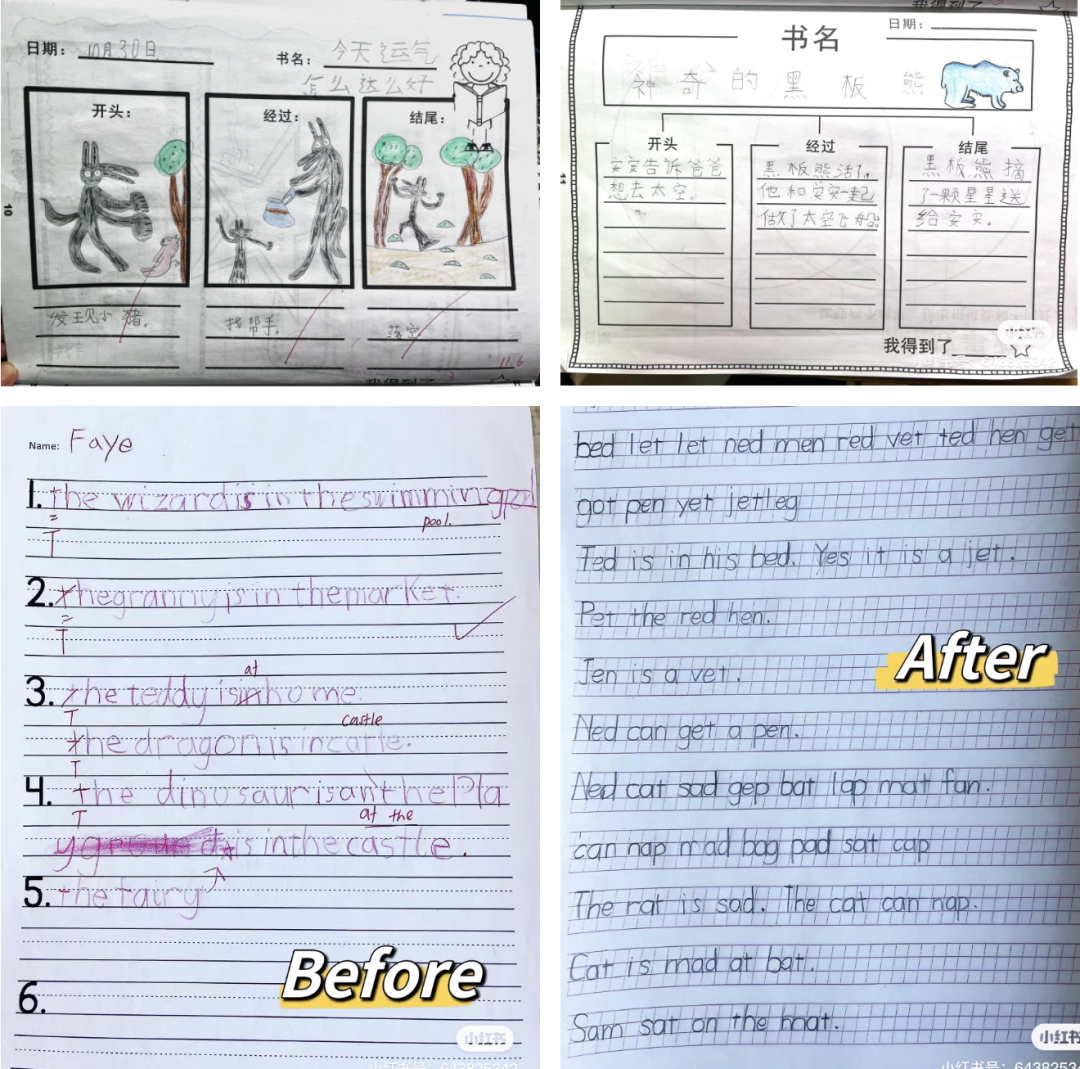 还有1年级结束的时候,儿子很自豪地跟她说:妈妈你看我刚进小学的时候,一张A4纸只能写出两句话,而现在我写英语作文的时候,一页都写不完,要翻面了!