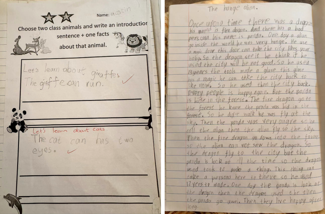 △哥哥Austin刚上1年级和1年级结束后的英文写作对比,妈妈说虽然词汇语法有错误,但孩子真的可以“滔滔不绝”了