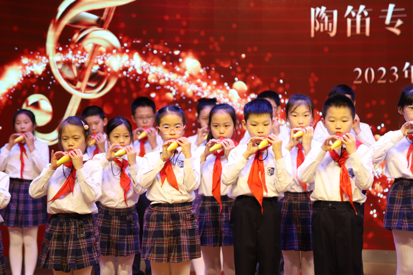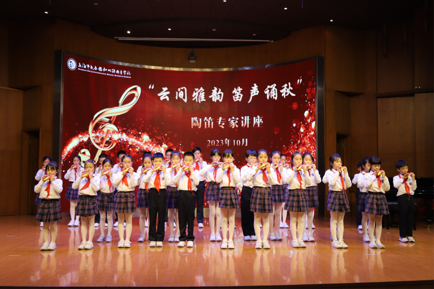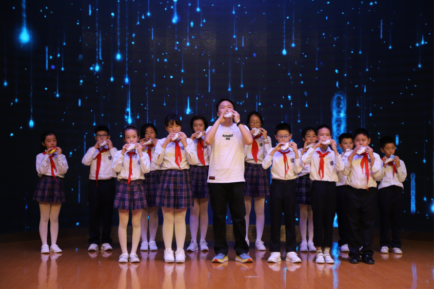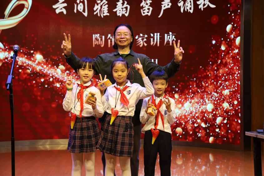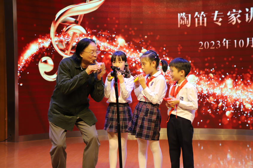 林烨老师的演讲完毕,由我校陶笛社徐康仪老师带领孩子们致敬大师,演奏林烨老师代表作《雨后的鼓浪屿》,孩子们的表演稚嫩且真诚,如林烨老师对他们寄予的希望,陶笛艺术将在每一位孩子们的身上发扬光大。