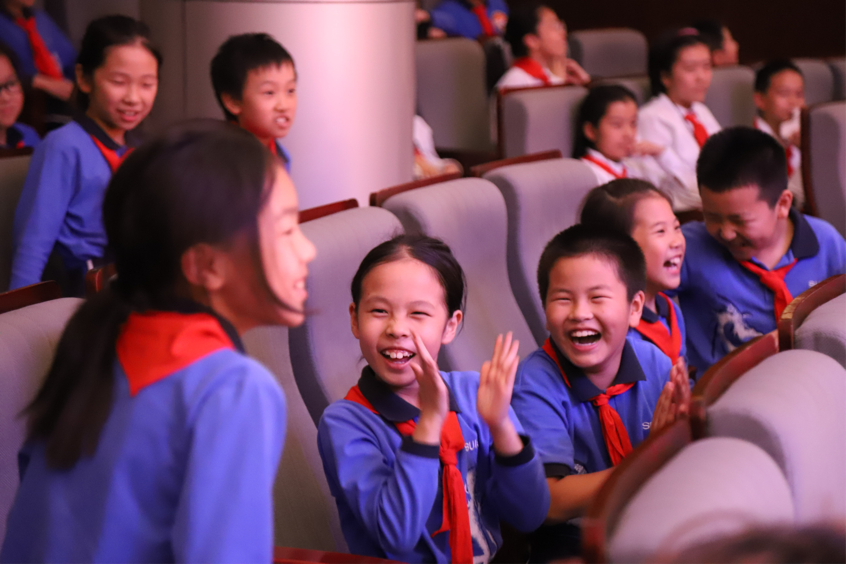 林烨老师向孩子们展示自己收藏的陶笛后,开始和孩子们玩起了音乐。从最初级的手指操,到模仿救护车、消防车警报音,模仿各种动物的叫声,全场师生都被深深吸引,时不时大笑鼓掌,欢乐满堂。在林老师风趣幽默的引导下,台下孩子们都不怯场了,小手高举,迫不及待要上台学习,潜移默化地建立了孩子们的自信与积极性。