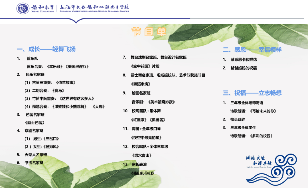 三年级书法、芭蕾、京剧、民乐、绘画各名家班,管乐队、合唱队、陶笛社团的同学们各展所长,用一个个精彩纷呈的节目给大家带来惊喜,开启美妙之旅!