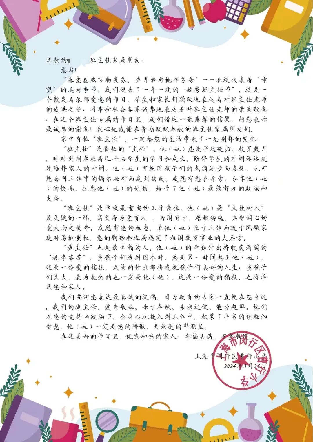 随后,她将一封给“班班”家属的感谢信递交到班主任们手中。纸短情长,感谢支持“班班”工作的所有人。