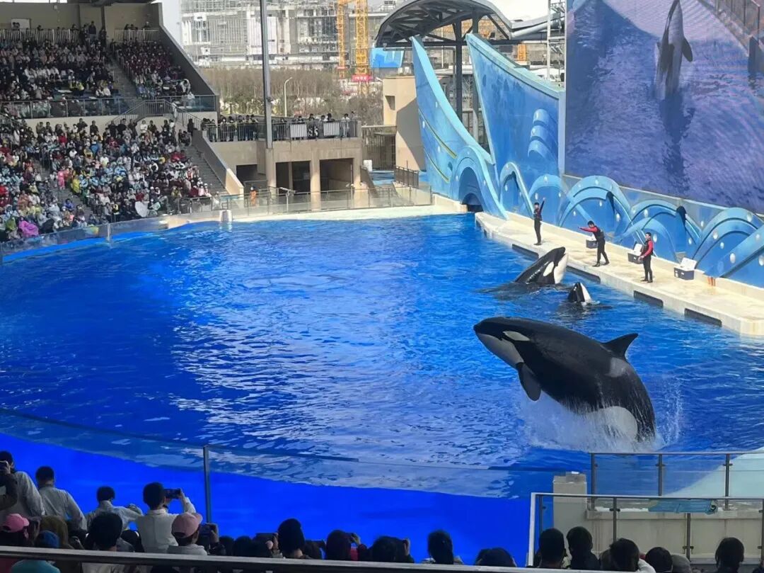 来到虎鲸剧场,同学们观看了虎鲸科普秀,巨大的虎鲸在水里游来游去,不时地翻转跳跃,高高地跳出水面再啪的一声落入水中,浪花四溅,有时还会调皮地用尾巴掀起阵阵波澜,引起一阵阵欢呼声!