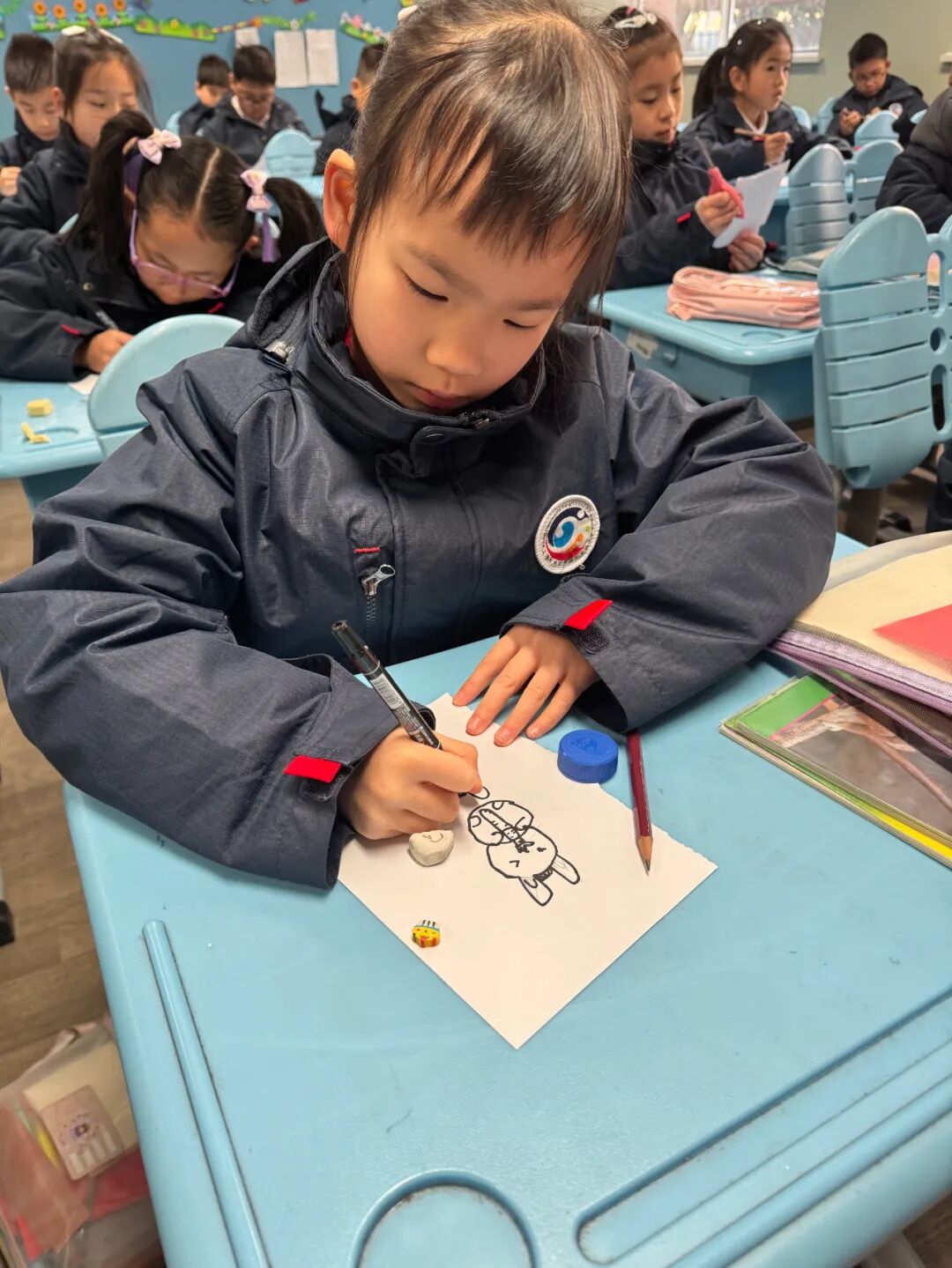二年级的“小乐乐”们利用废弃的瓶盖、旧橡皮、彩笔等,通过调整橡皮位置,让这些原本没有使用价值的生活材料,变成了“打不倒的小勇士”。他们在实践中初步感受到了重心在生活中的应用,培养了科学思维。