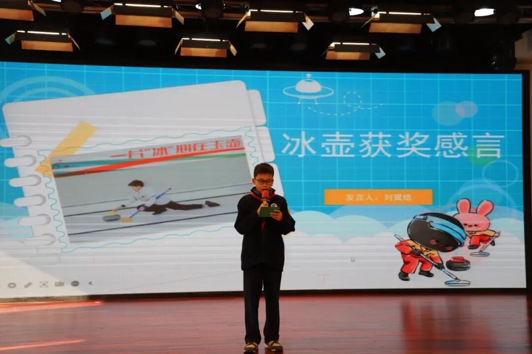 市运会冰壶混双冠军刘翼焓同学作为学生代表荣耀登台,他鼓舞着每一位“小乐乐”,激励大家继续勇往直前,不断追求卓越。