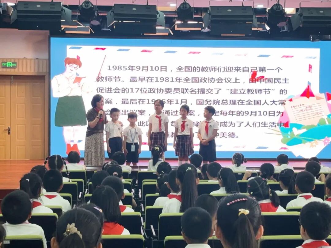9月9日上午,徐汇实验小学举行了主题为“我给老师颁个奖”的升旗仪式。焦校长携手五位学生代表,共同回顾了教师节的历史,并向全体教师致以节日祝福,鼓励教师们继续用爱与希望浇灌孩子们的心田,培育新时代的好少年!