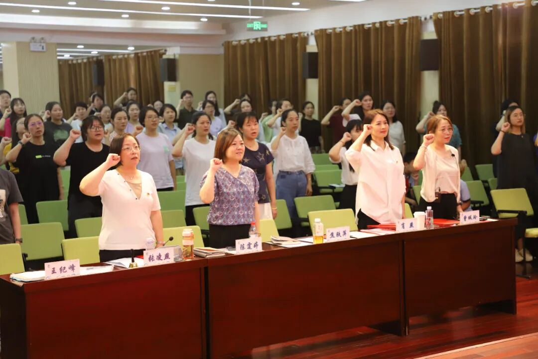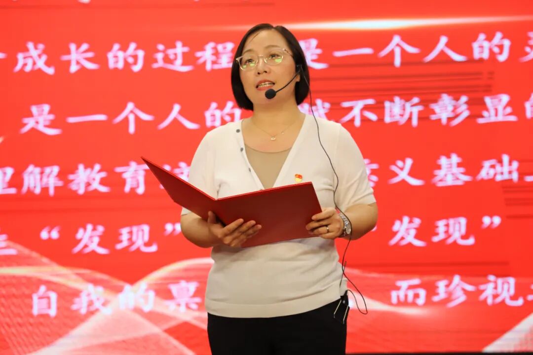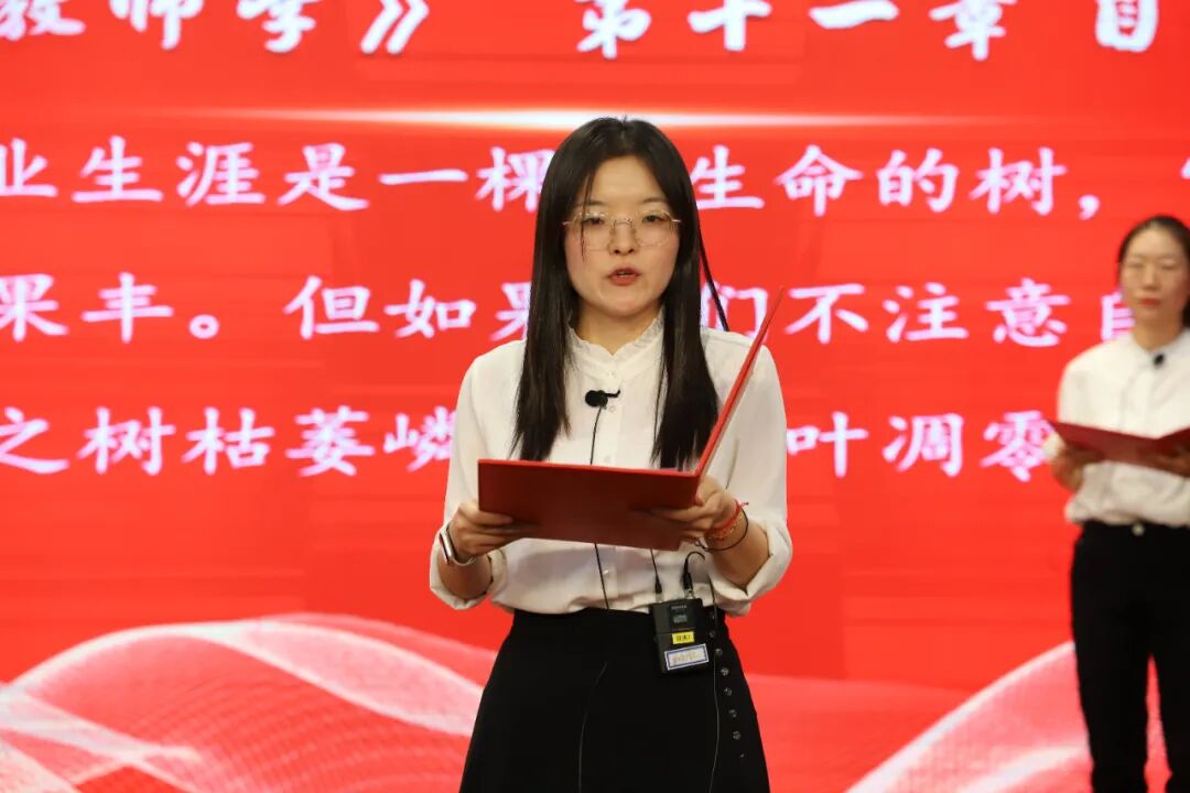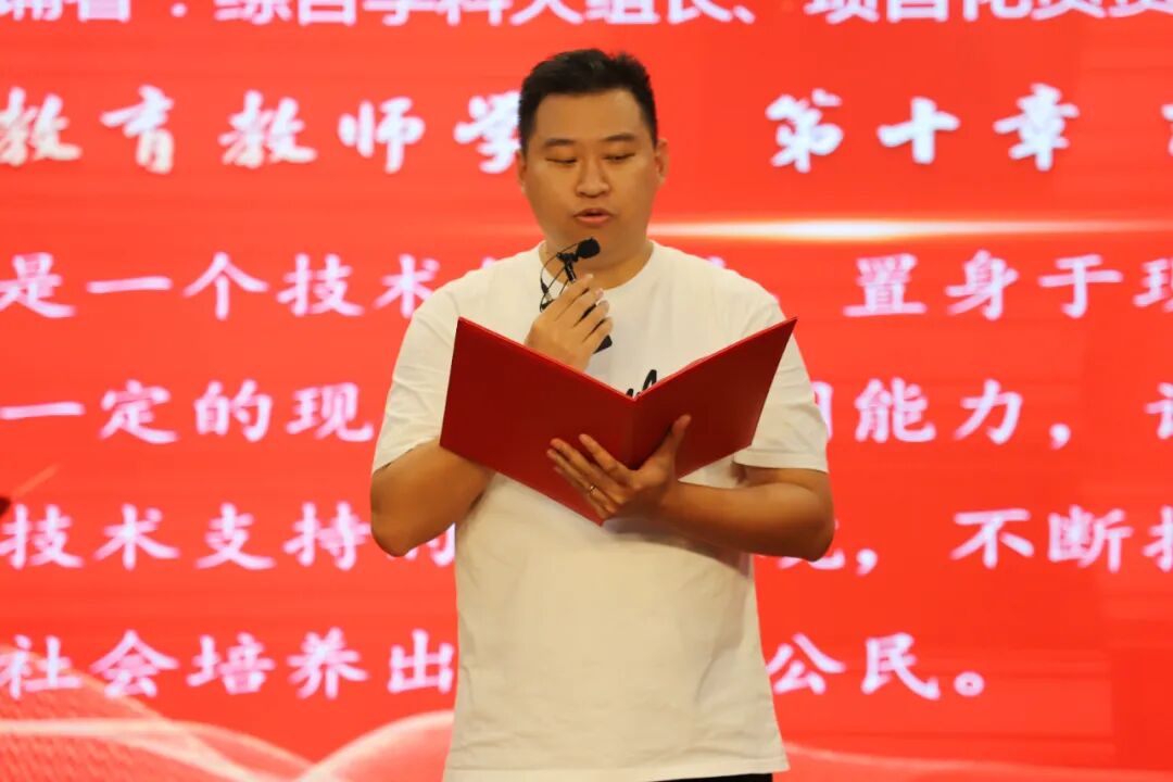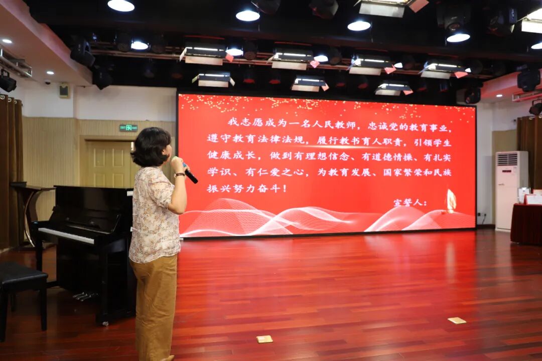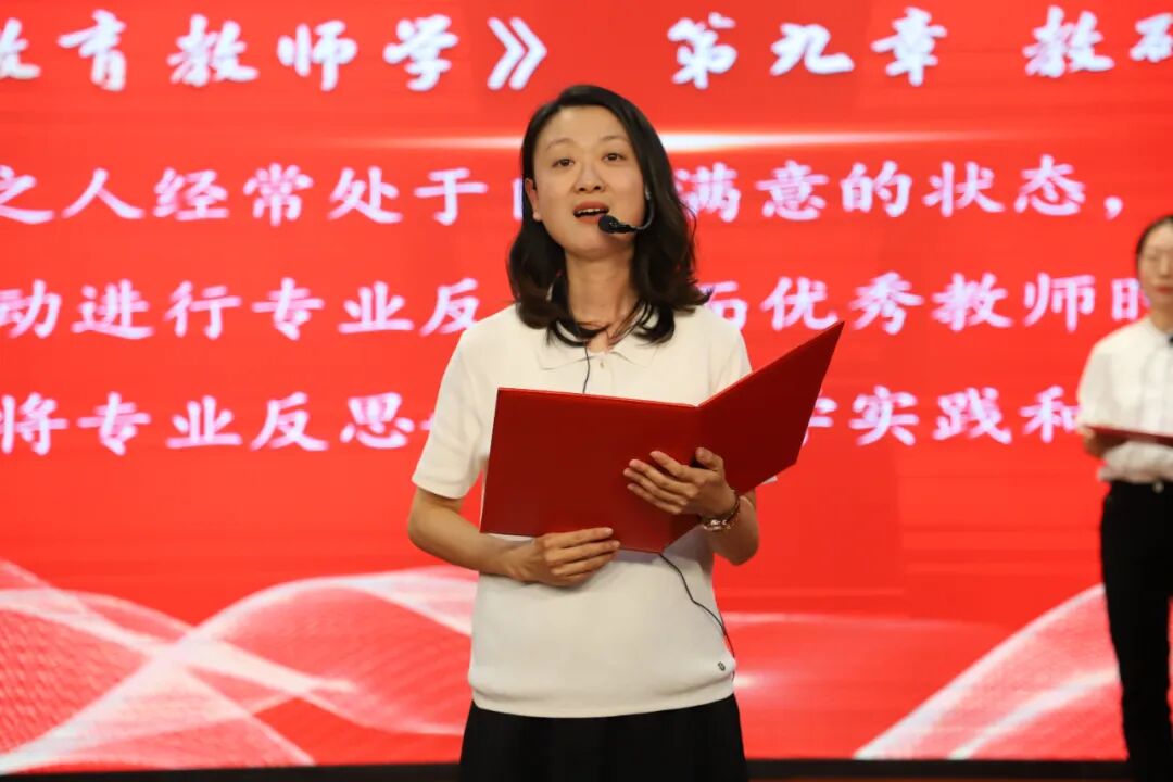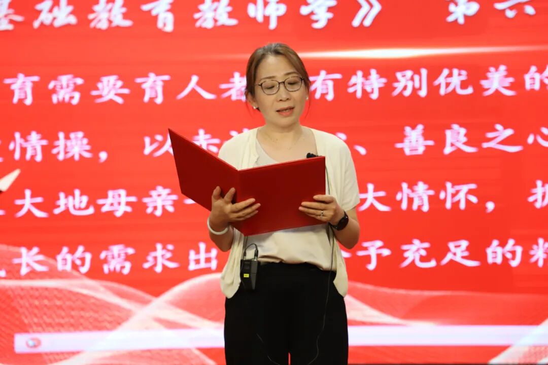 教师们铿锵有力地朗诵着《基础教育教师学》,赢得了大家热烈的掌声。这一庄严的朗诵不仅深化了教师对教育使命的认识,更坚定了教师们作为教育工作者的责任与担当。随后由焦校长带领全体教职工庄严宣誓,要将自己的青春和热情投入到基础教育事业中,为教育发展、国家繁荣和民族振兴努力奋斗!