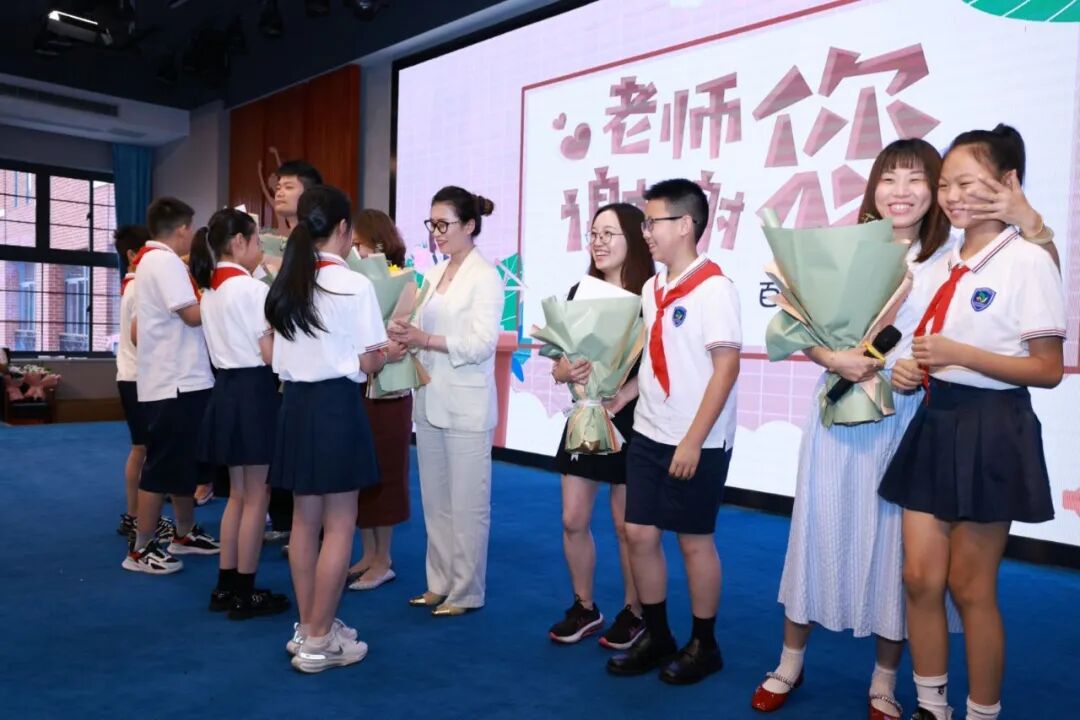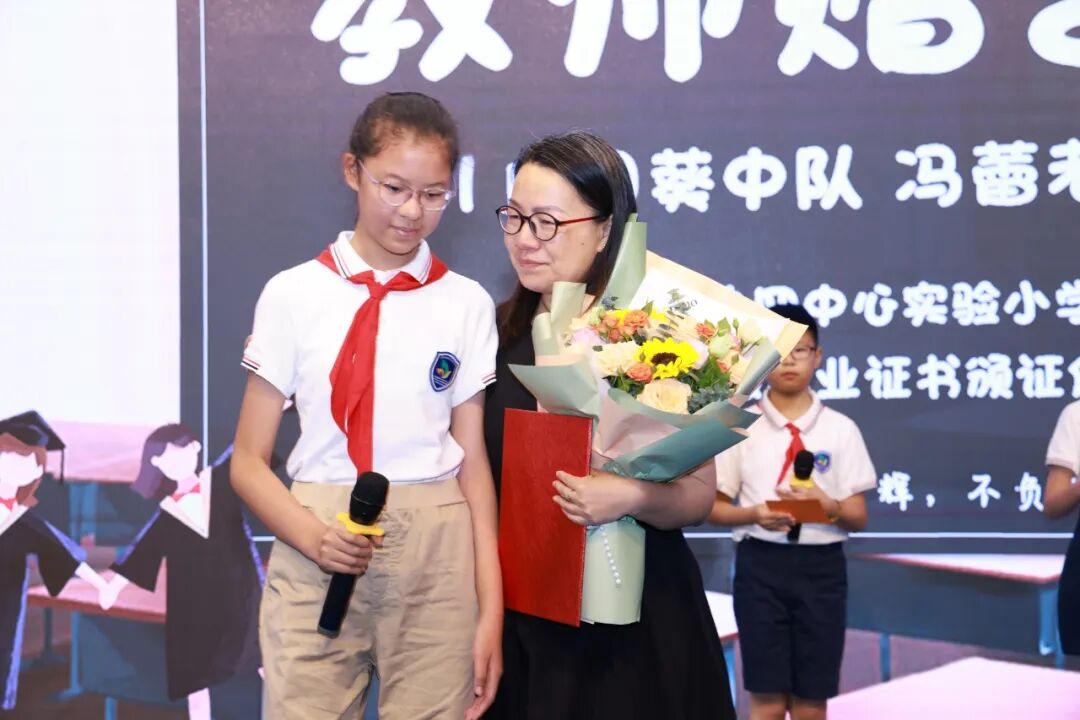 这份深厚的师生情谊,在献花时刻绽放光彩。孩子们手捧鲜花,缓步走向老师,将花束轻轻递出,一个拥抱、一个眼神,满是不舍与感恩。礼堂里爱意流淌,温情动人。