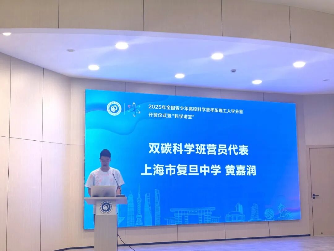 在开营仪式上,我校黄嘉润同学作为营员代表作发言分享,表达了在华东理工大学的沃土上汲取智慧、磨砺意志,点亮心中的科学之光作为此行的目的,勇担科学创新的青春使命。
