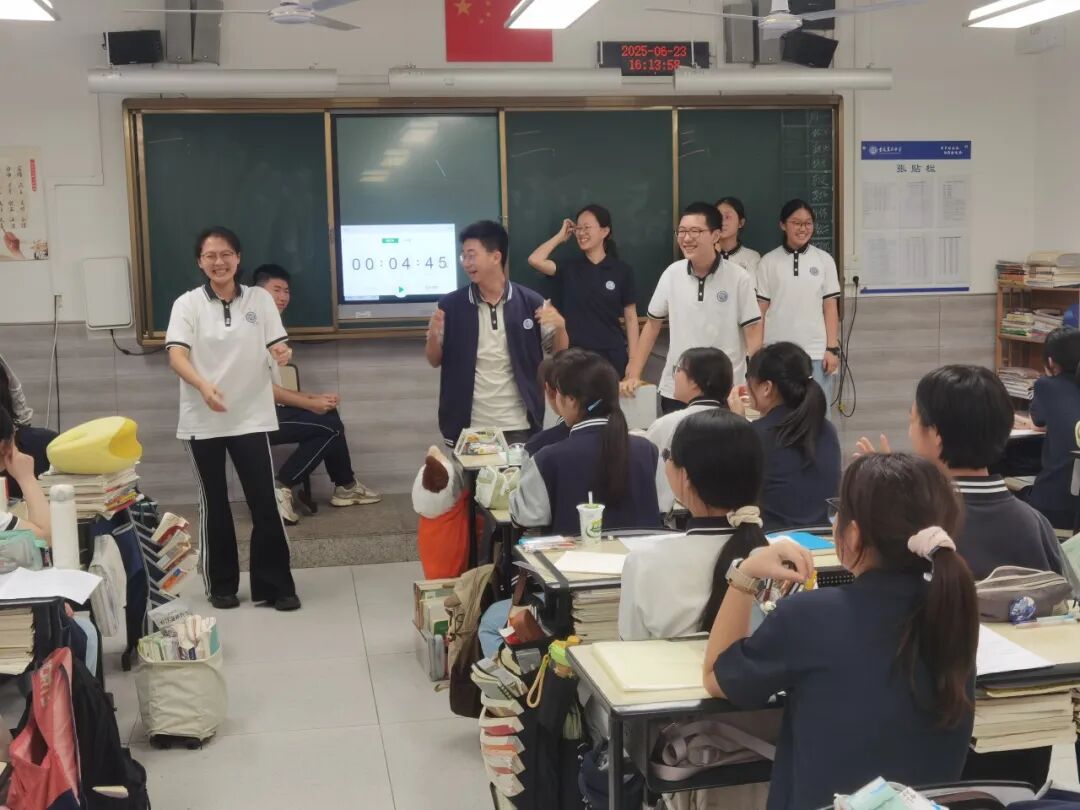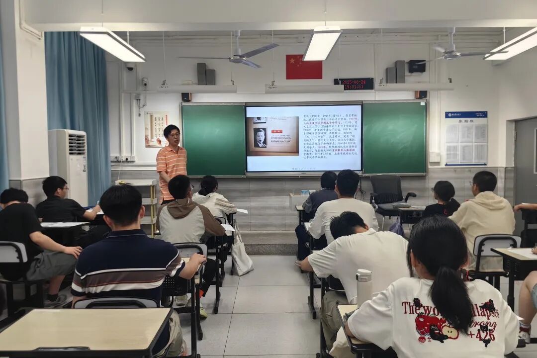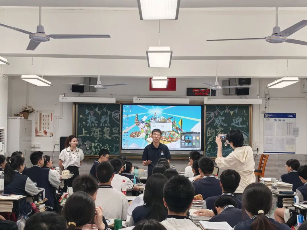 在主题班会上,周麒副校长引领大家回溯践行活动足迹:从披星启程的沪渝航班,到凝刻中华文明的大足石刻;自启动仪式开启的校际情缘,至插班课堂碰撞的思维火花……同学们共同梳理研学的体悟与成长,分享心得。这场及时的思想淬炼,为后续征程点亮明灯。熊文博老师对在践行中看到的一些与复旦中学相关的历史名人专门做了详细介绍,如费巩被国民党特务关押在渣滓洞秘密杀害;胡绳参与起草《关于建国以来党的若干历史问题修改》、参与修订新宪法,晚年回到上海探望母校;邵力子敲响了上海五四运动第一钟……在所思所感中,大家的爱校荣校之情油然而生。