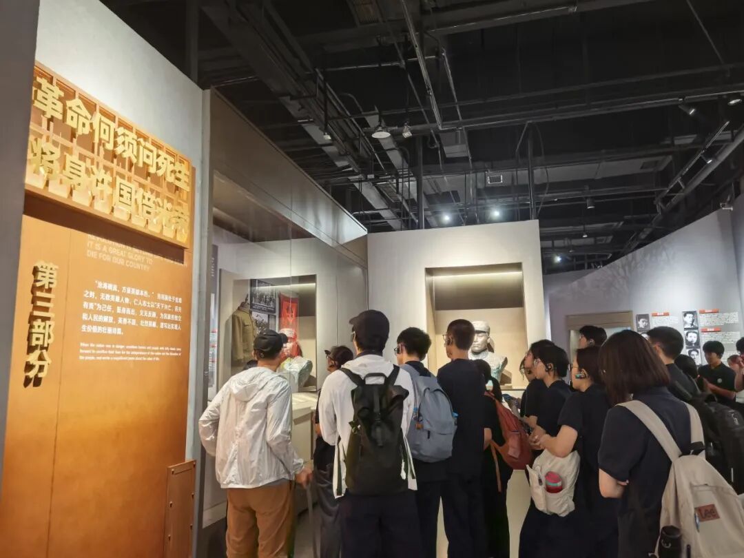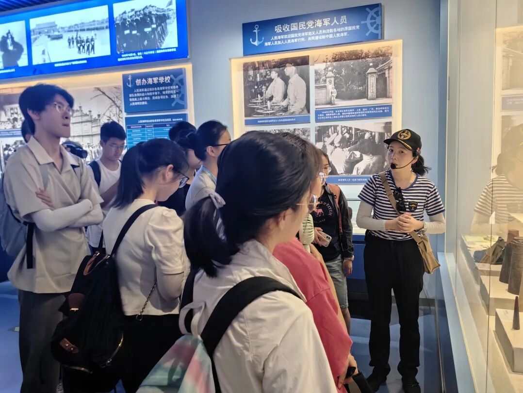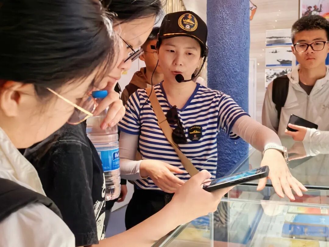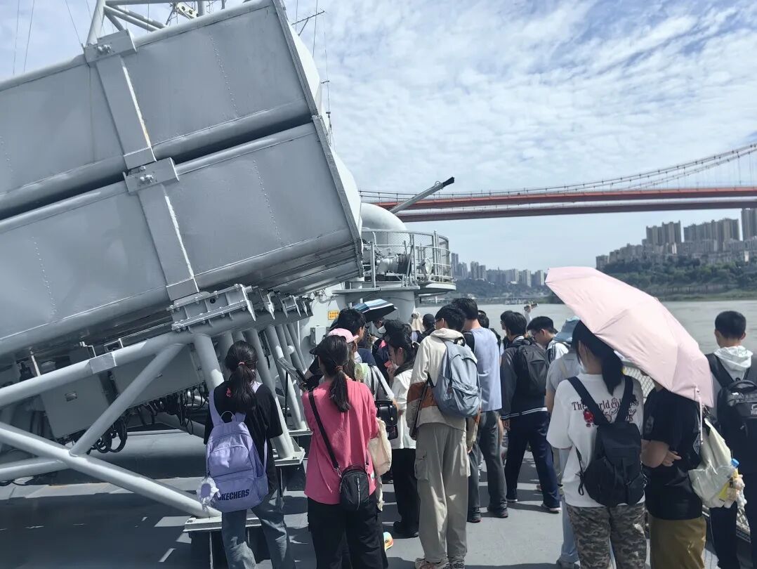在建川海疆博物馆,专业讲解员的细致解说为大家揭开了海军历史的神秘面纱。同学们了解到军舰命名规则的严谨性、中国海军建立的艰难历程以及其波澜壮阔的发展轨迹,还深入探究了1955年海陆空三军协同作战解放江山岛和大陈岛等重大历史事件。站在观景平台上,长江的壮阔波涛尽收眼底,而166舰则如钢铁巨龙般威严地横卧江畔,其120余米的舰体宛如龙脊般蜿蜒,庞大的舰岛和高耸的桅杆尽显雄伟气势。深入舰艇内部,同学们近距离观摩了两侧的鱼雷、二十四炮反潜火箭深弹等先进武器,而狭小的海军宿舍和视频中展示的艰苦训练日常,更是让同学们深受触动。从白马庙的艰难建军,到保家卫国的自卫反击战,再到如今逐梦深蓝的壮志豪情,馆内每一件展品都铭刻着人民海军的奋斗足迹,那是对捍卫海疆的热血承诺。