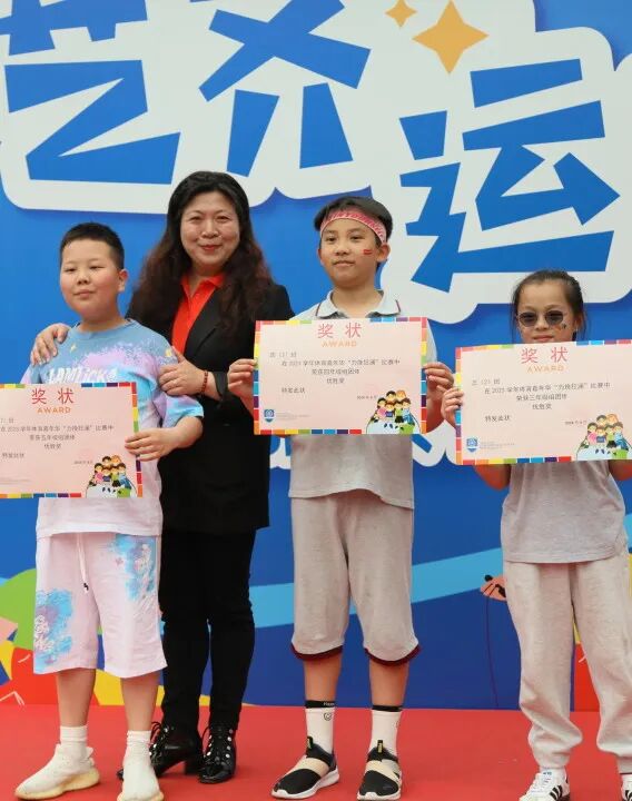 理想是成功的起跑线,决心是起跑时的枪声,行动犹如跑者全力地奔驰,唯有坚持到最后一秒,方能获得最终的胜利。在激动人心的颁奖环节,瞿祖芳副校长、陈慧副书记、傅筠主任、朱晓红和俞军副主任分别为家长代表和学生代表颁发奖状和奖牌。傅筠主任为本届体育嘉年华冠军得主——四(3)班颁发冠军奖杯和奖状。