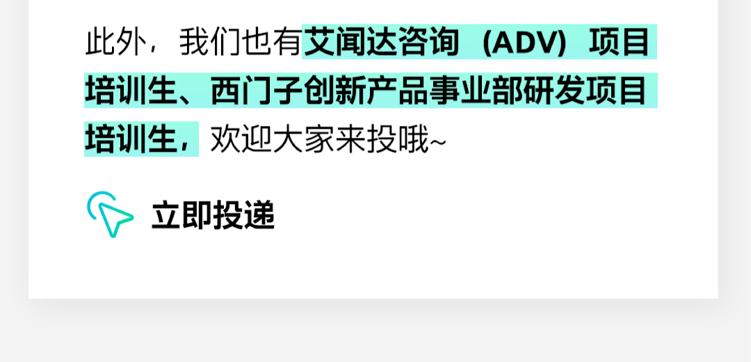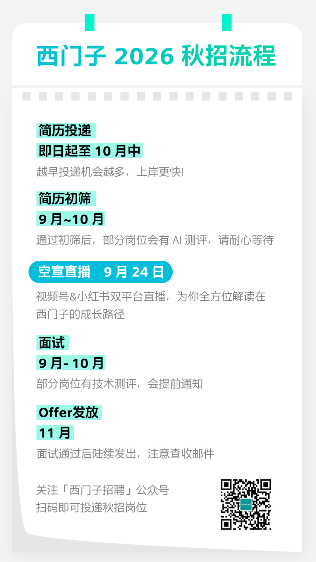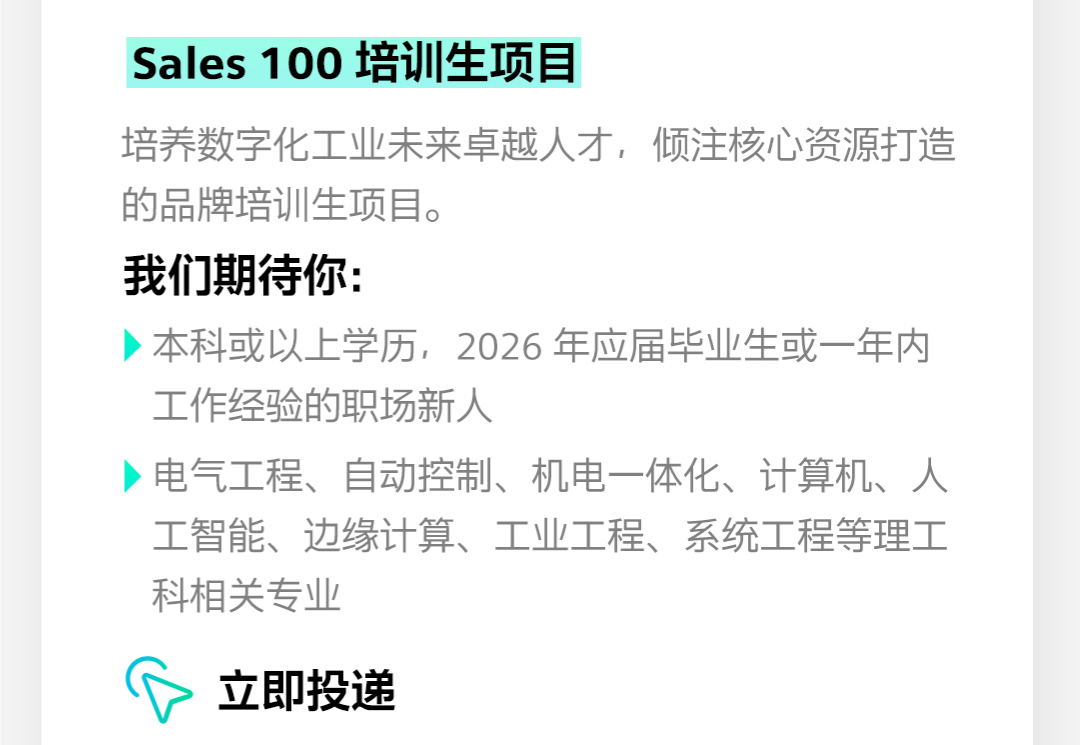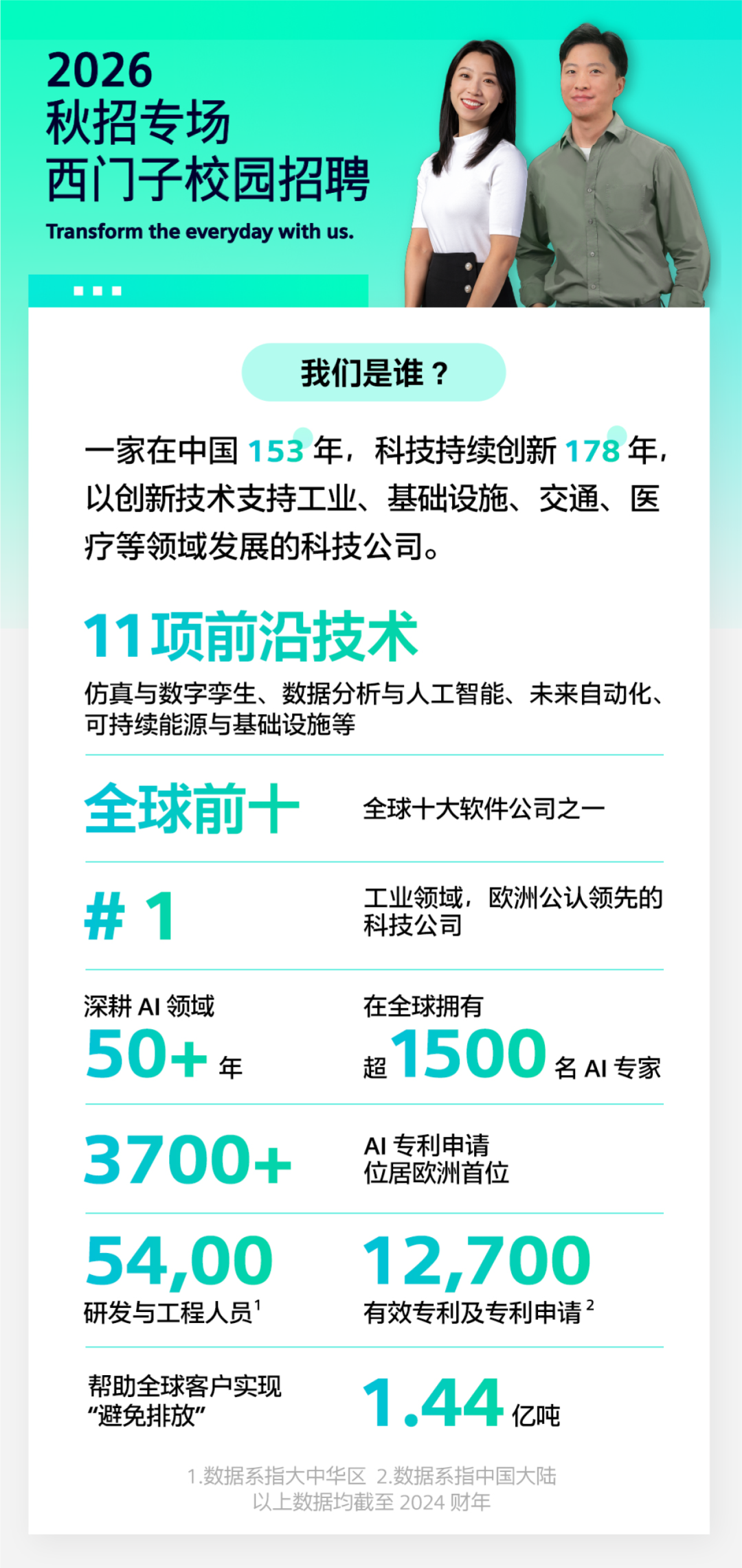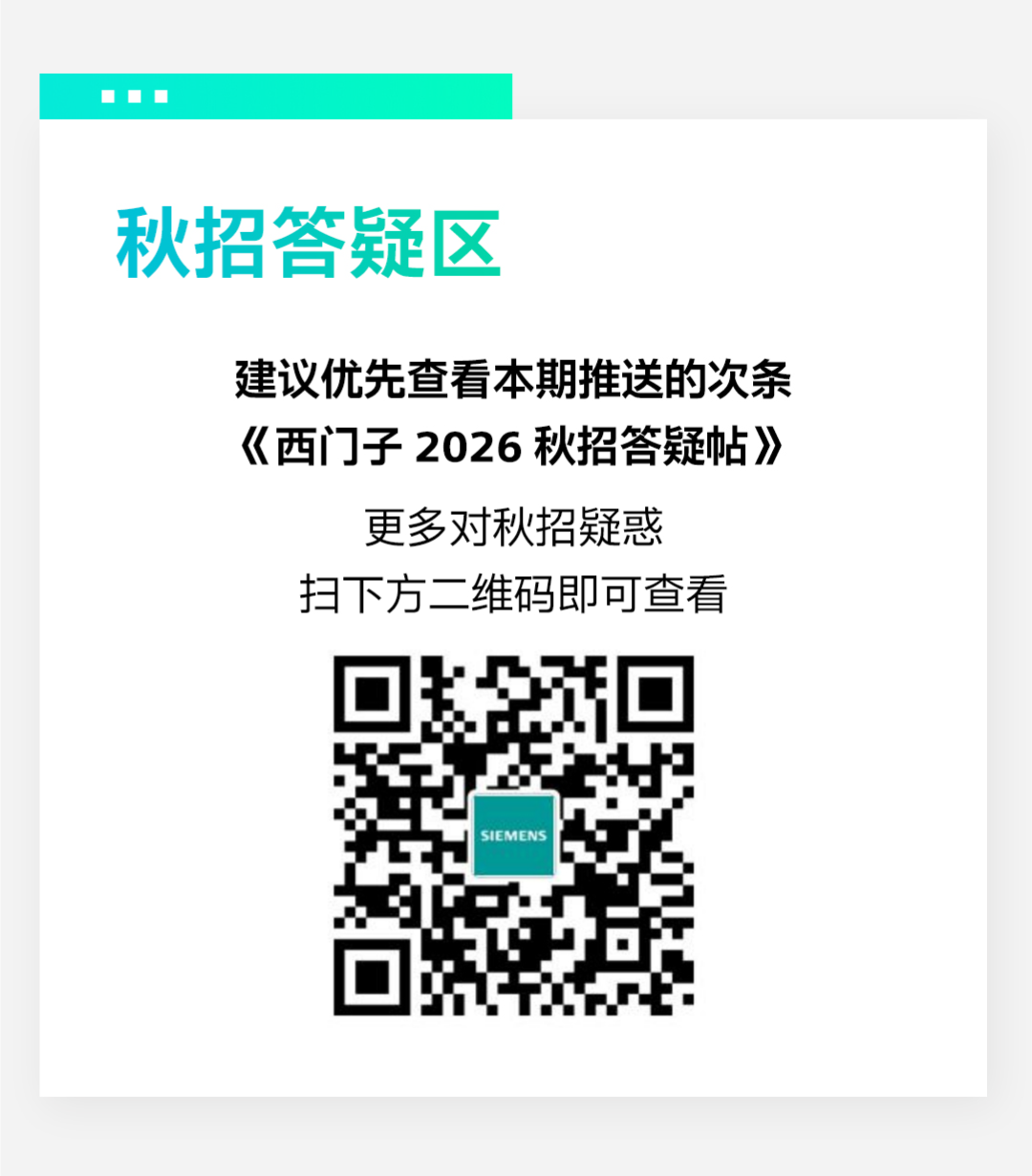 文章内容来源于公众号:西门子招聘,点此可查看原文,内容版权归相关企业所有,本网站仅供交流学习。若涉及版权问题或存在侵权情况,请及时与我们联系,我们将第一时间进行删除处理。
